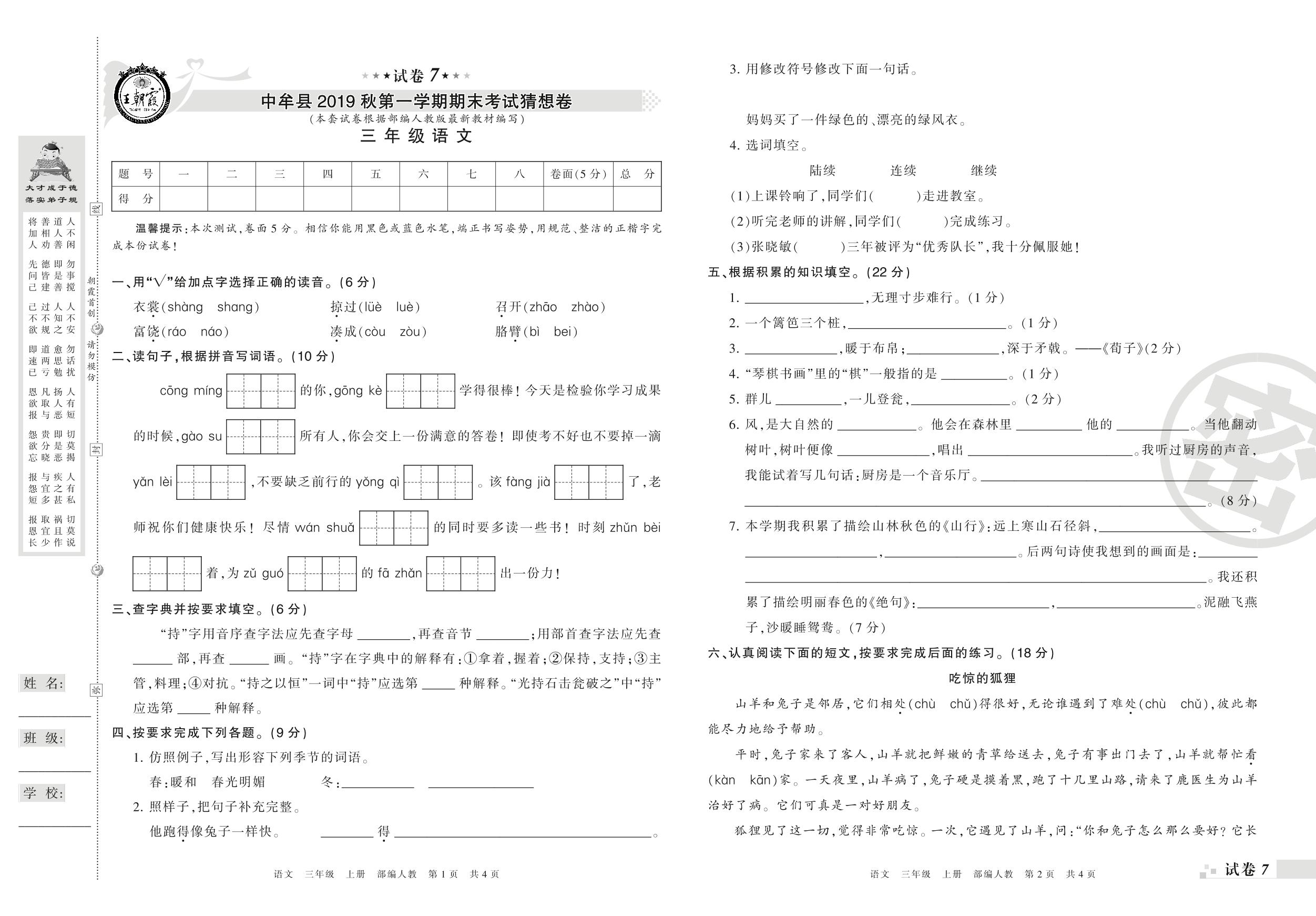 2018-2019学年第一学期郑州市中牟县猜想卷三年级语文试卷(人教版)【7】