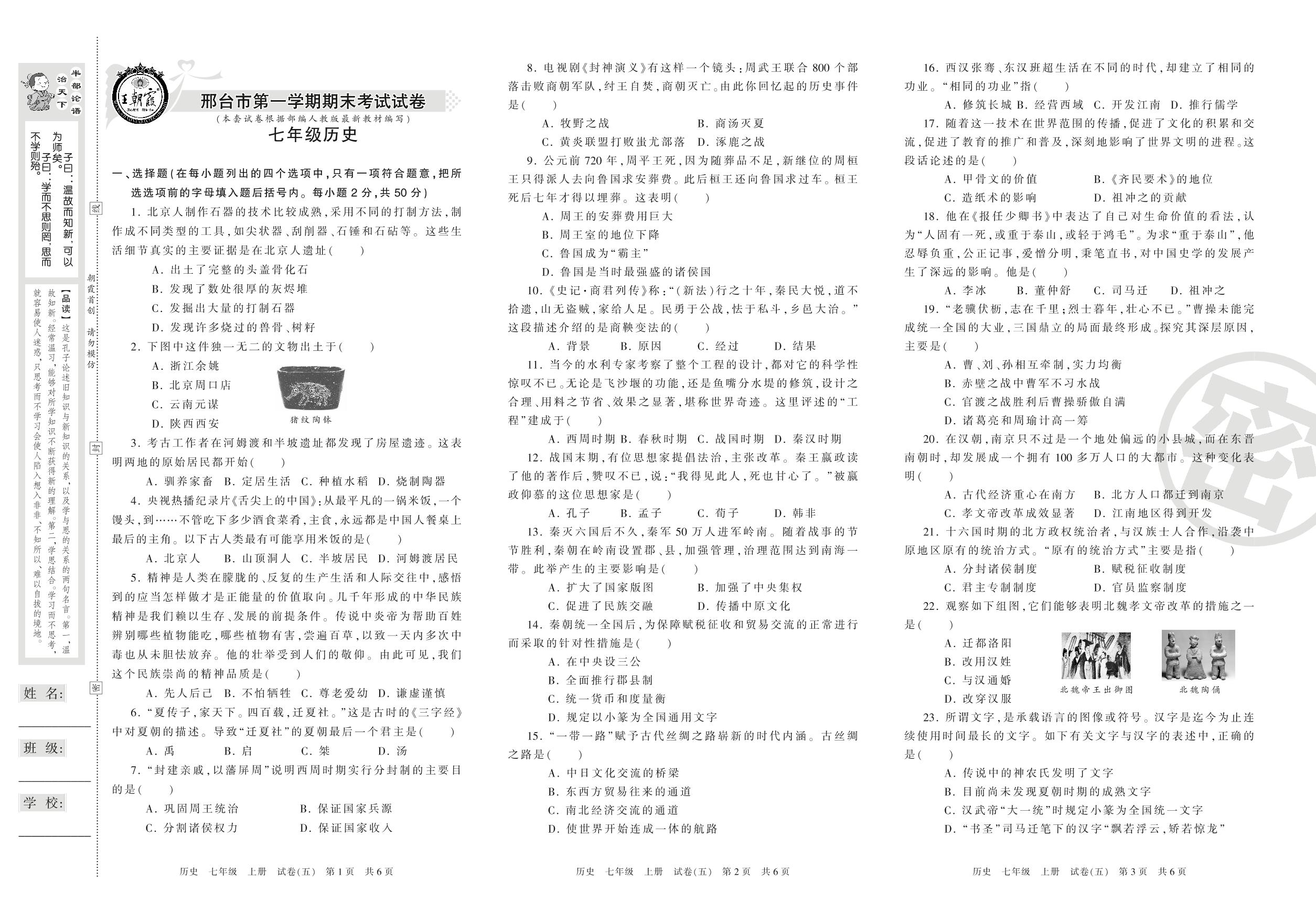 2016-2017学年第一学期河北卷邢台市七年级历史试卷(人教版)【5】