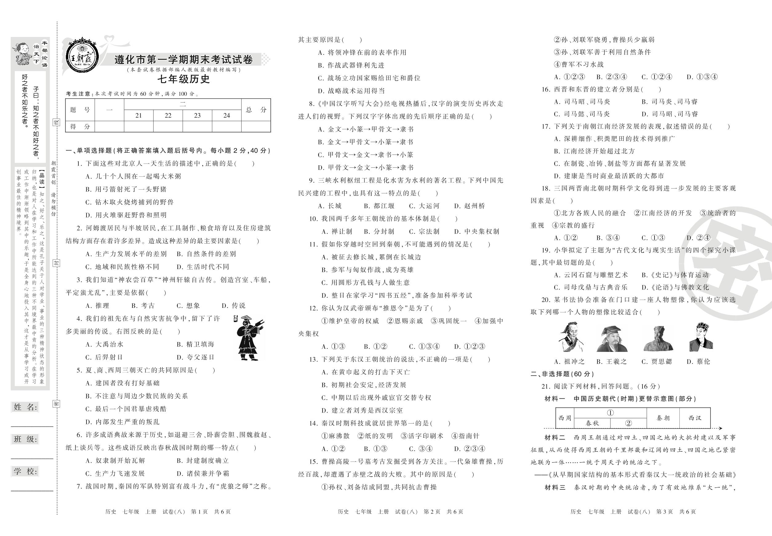 七年级历史人教版上册期末卷