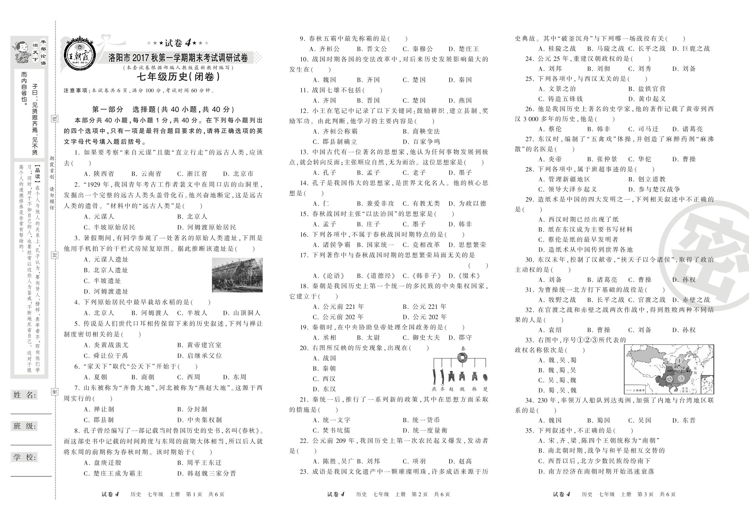 2016-2017学年第一学期洛阳市七年级历史试卷(人教版)【4】