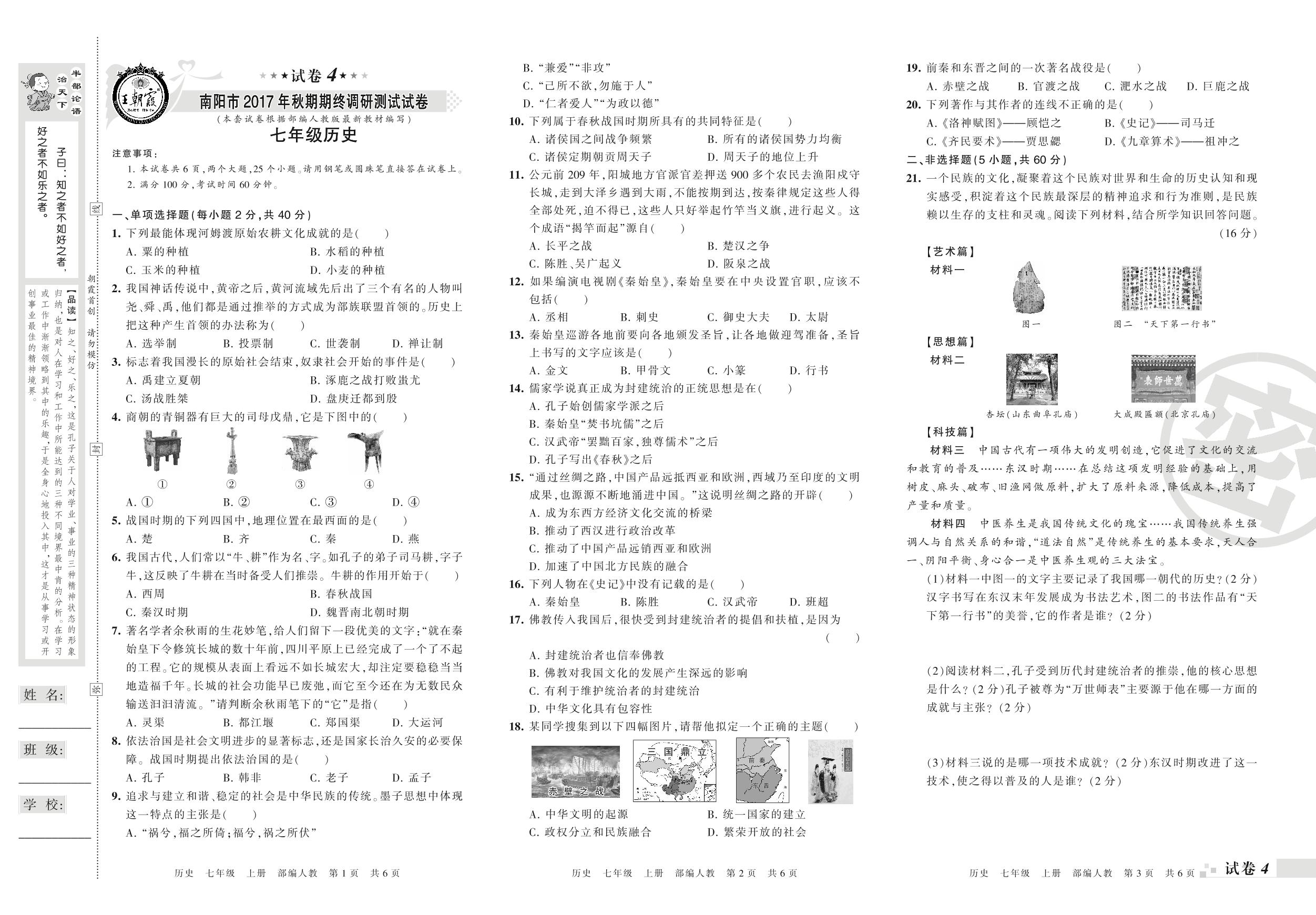 2017-2018学年第一学期南阳市七年级历史试卷(人教版)【4】