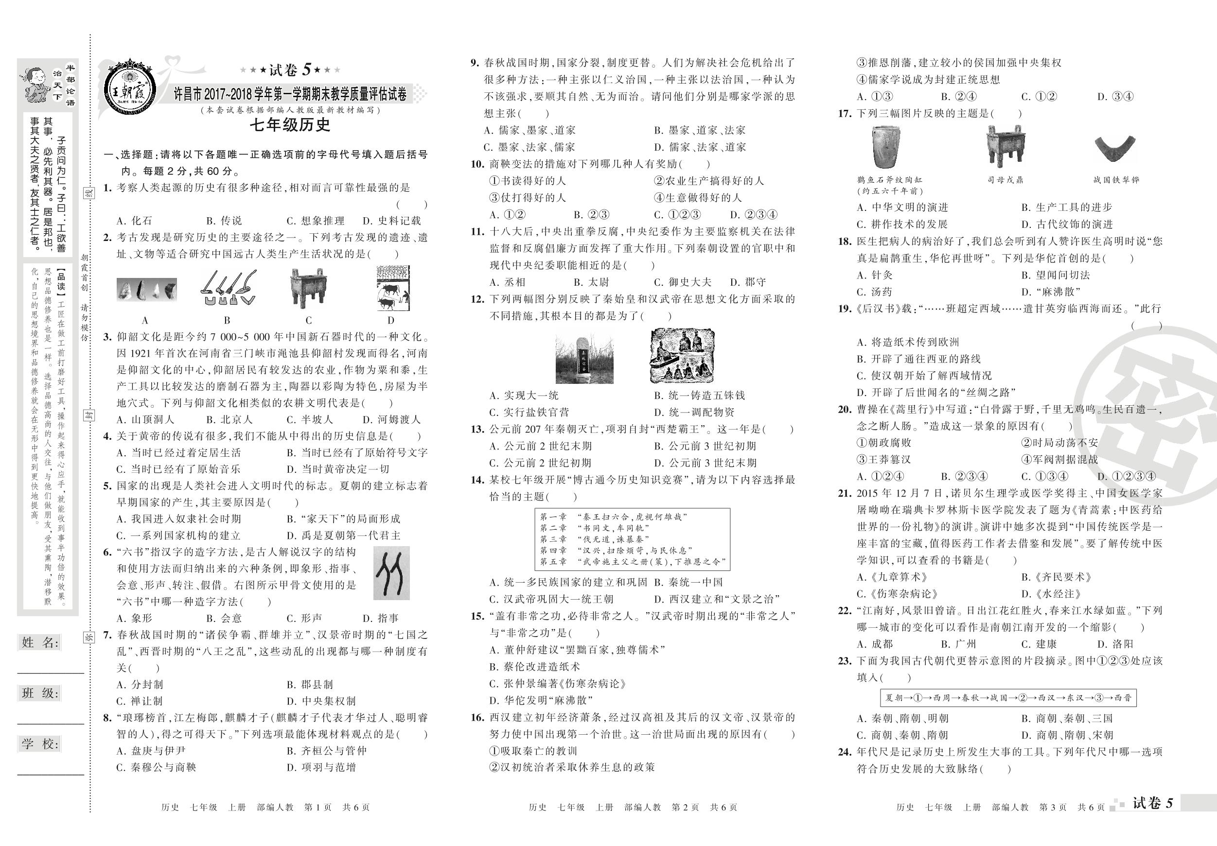 2017-2018学年第一学期许昌市七年级历史试卷(人教版)【5】