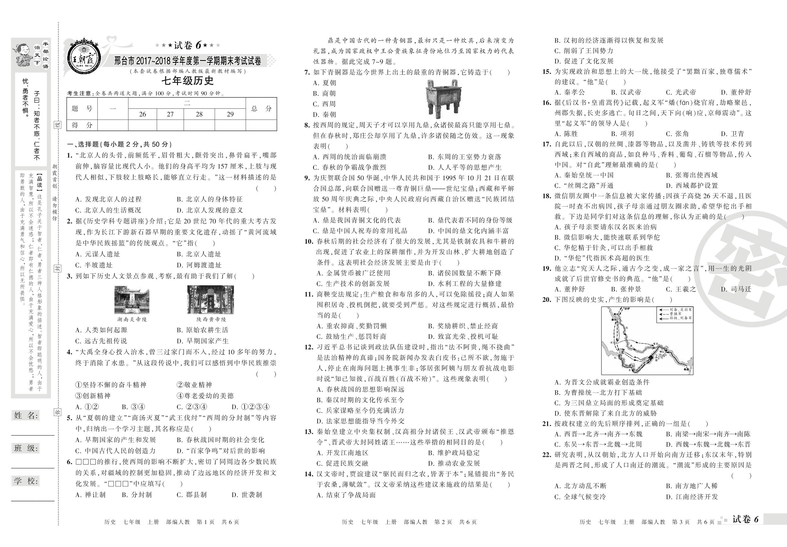 2017-2018学年第一学期邢台市七年级历史试卷(人教版)【6】
