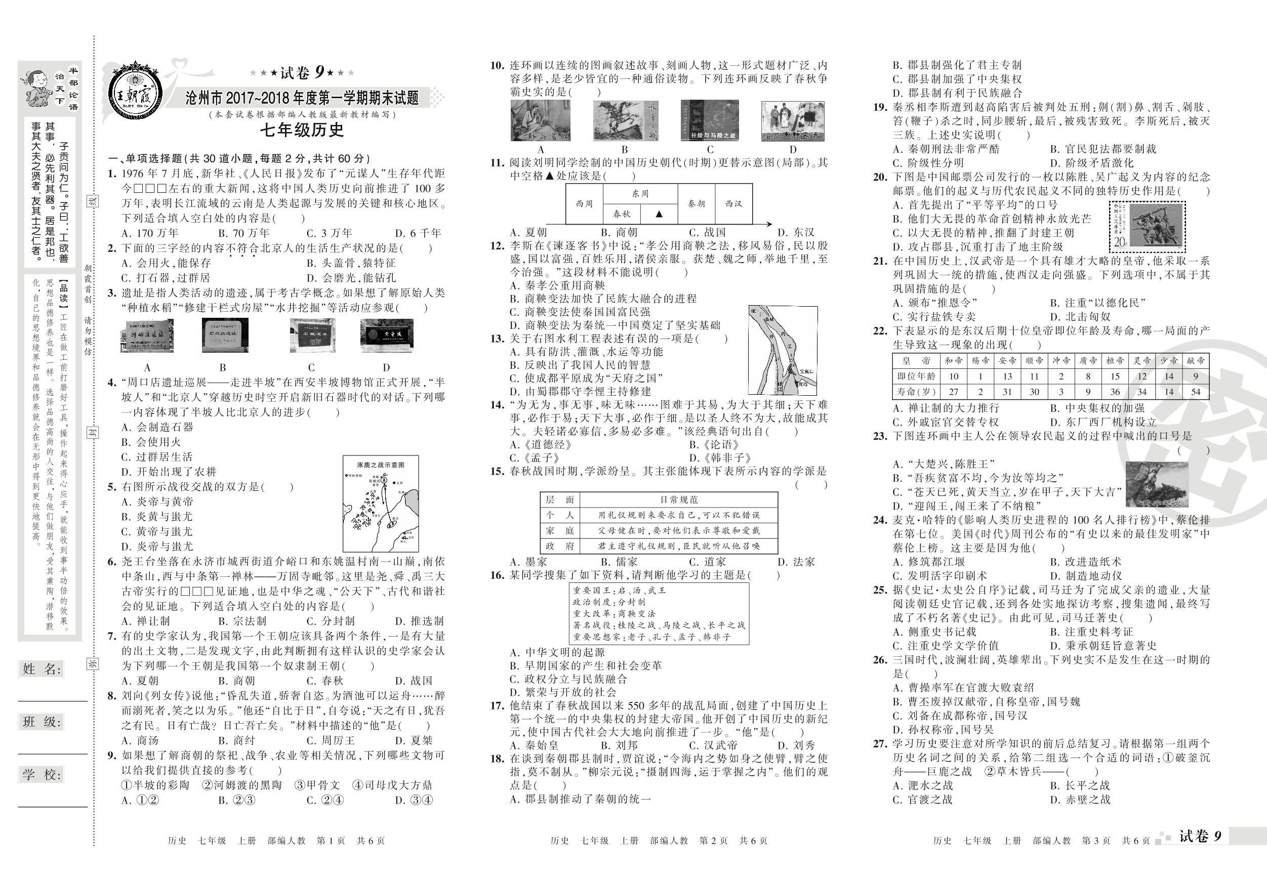 2017-2018学年第一学期沧州市七年级历史试卷(人教版)【9】
