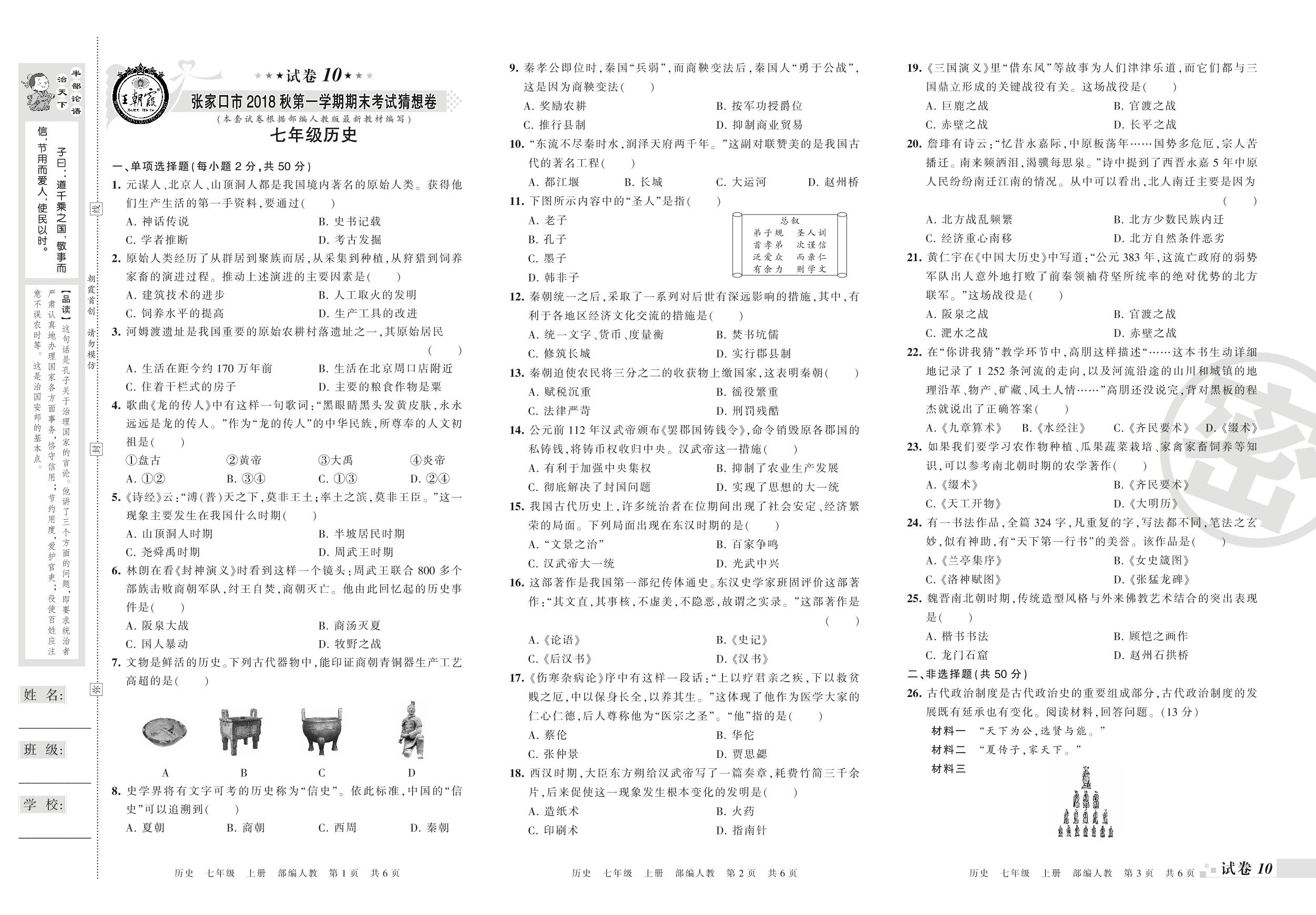 2017-2018学年第一学期张家口市七年级历史试卷(人教版)【10】