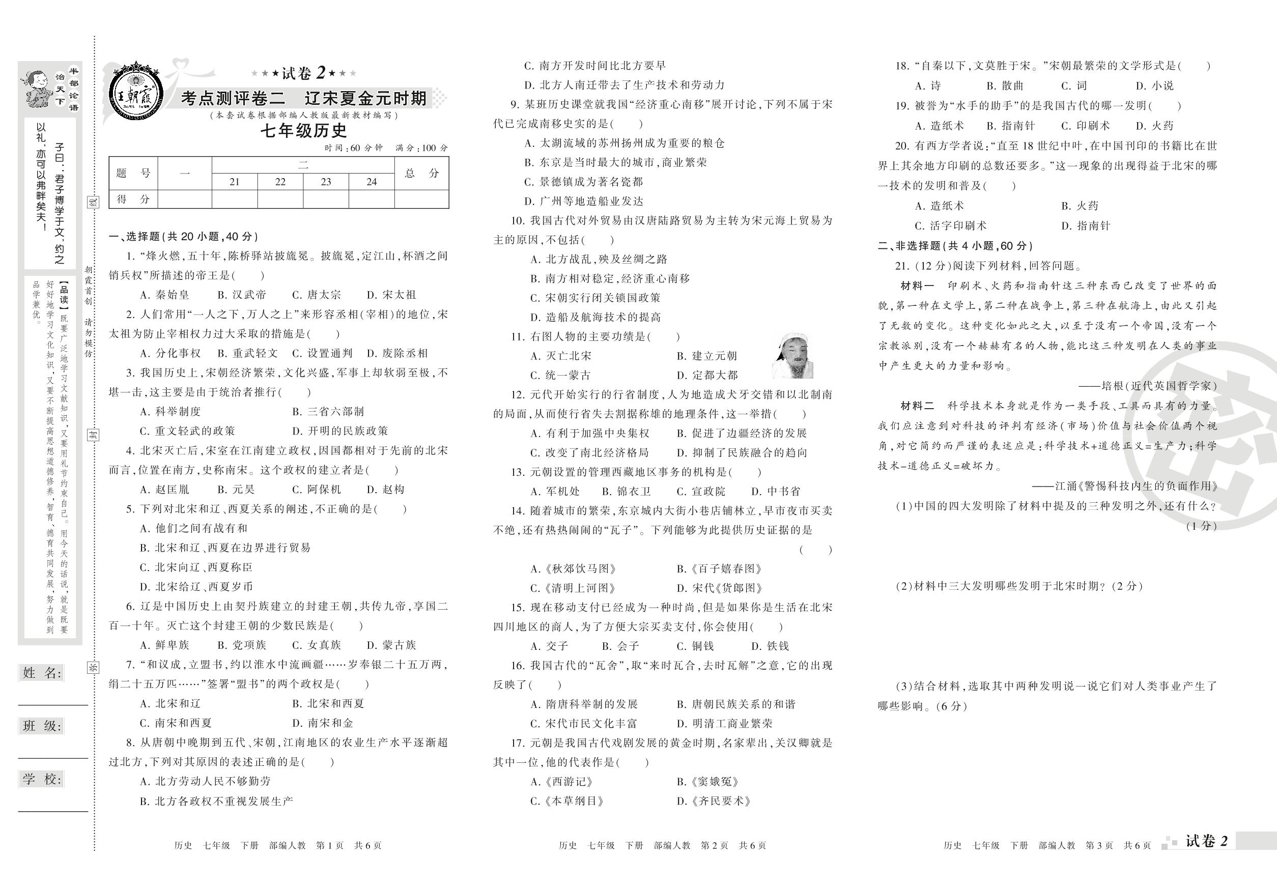 王朝霞期末测评卷——考点测评卷二 辽宋夏金元时期七年级下册历史(人教版)【2】