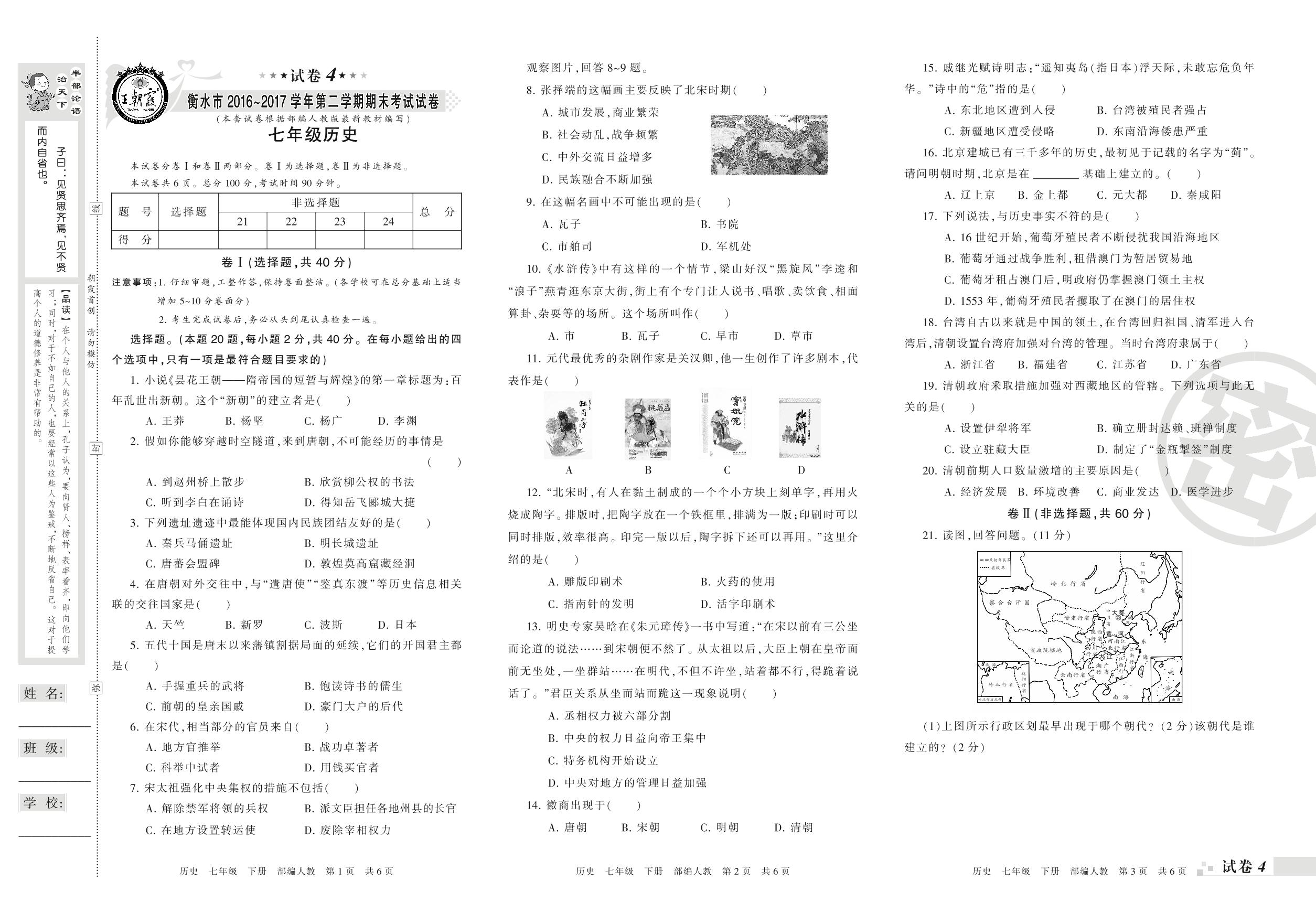 2016-2017学年第二学期衡水市七年级历史试卷(人教版)【4】