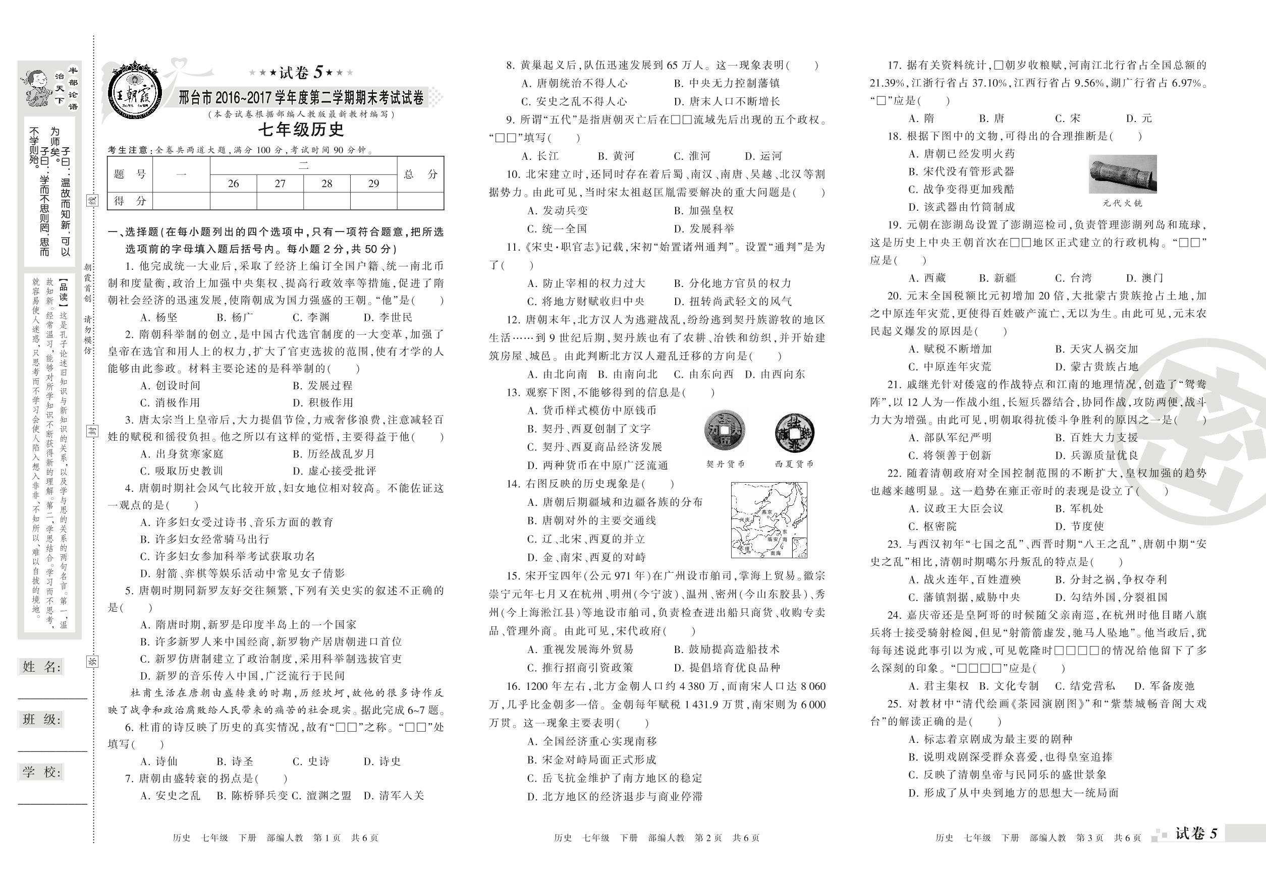 2016-2017学年第二学期邢台市七年级历史试卷(人教版)【5】