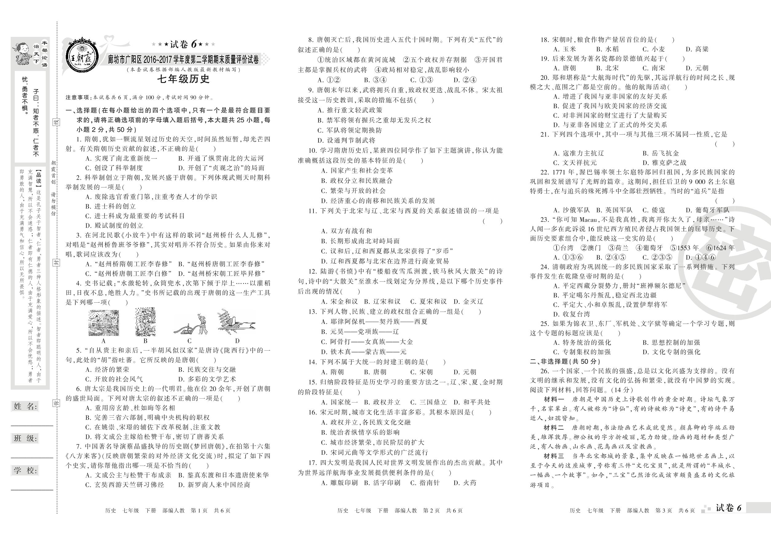 2016-2017学年第二学期廊坊市广阳区七年级历史试卷(人教版)【6】