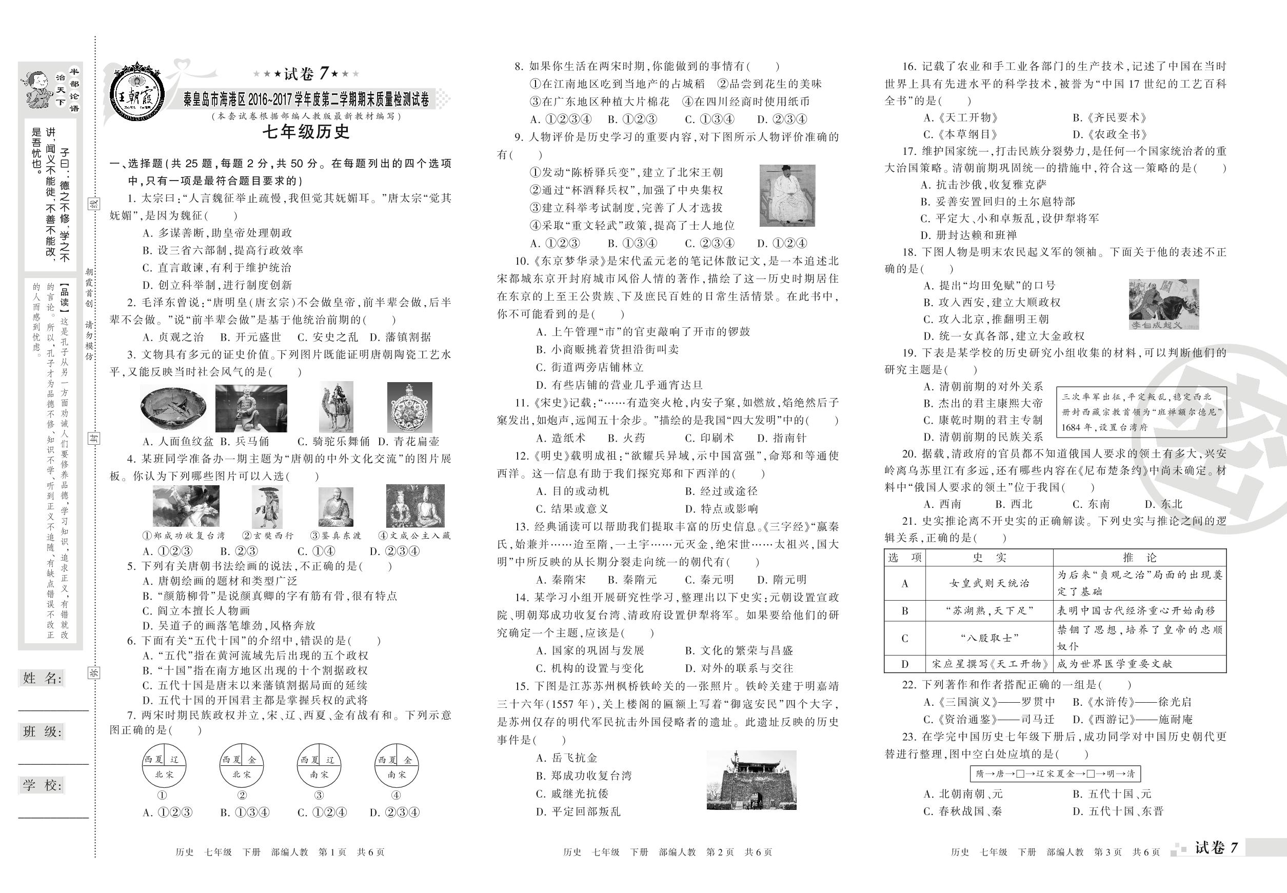 2016-2017学年第二学期秦皇岛市海港区七年级历史试卷(人教版)【7】