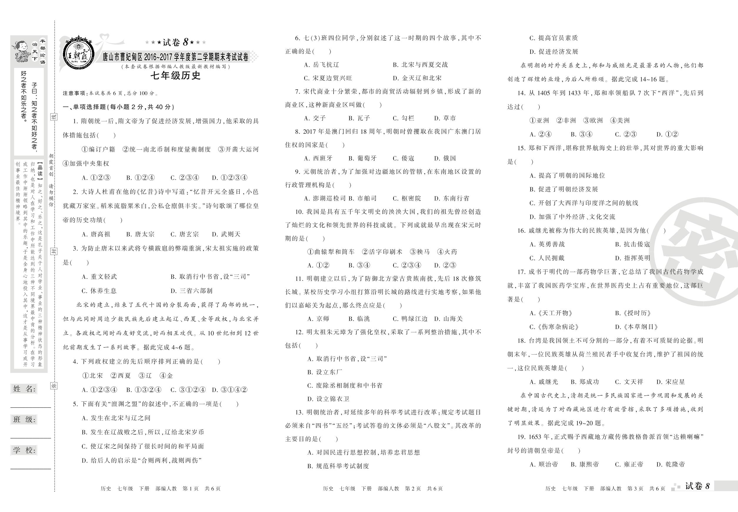2016-2017学年第二学期唐山市曹妃甸区七年级历史试卷(人教版)【8】