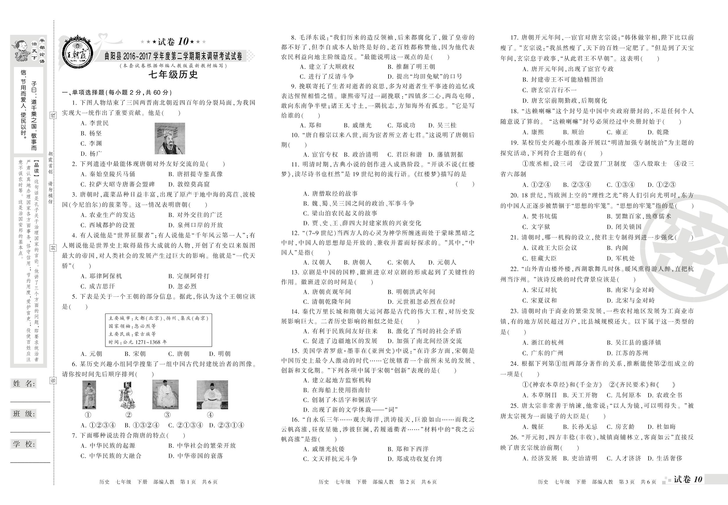 2016-2017学年第二学期保定市曲阳县七年级历史试卷(人教版)【10】
