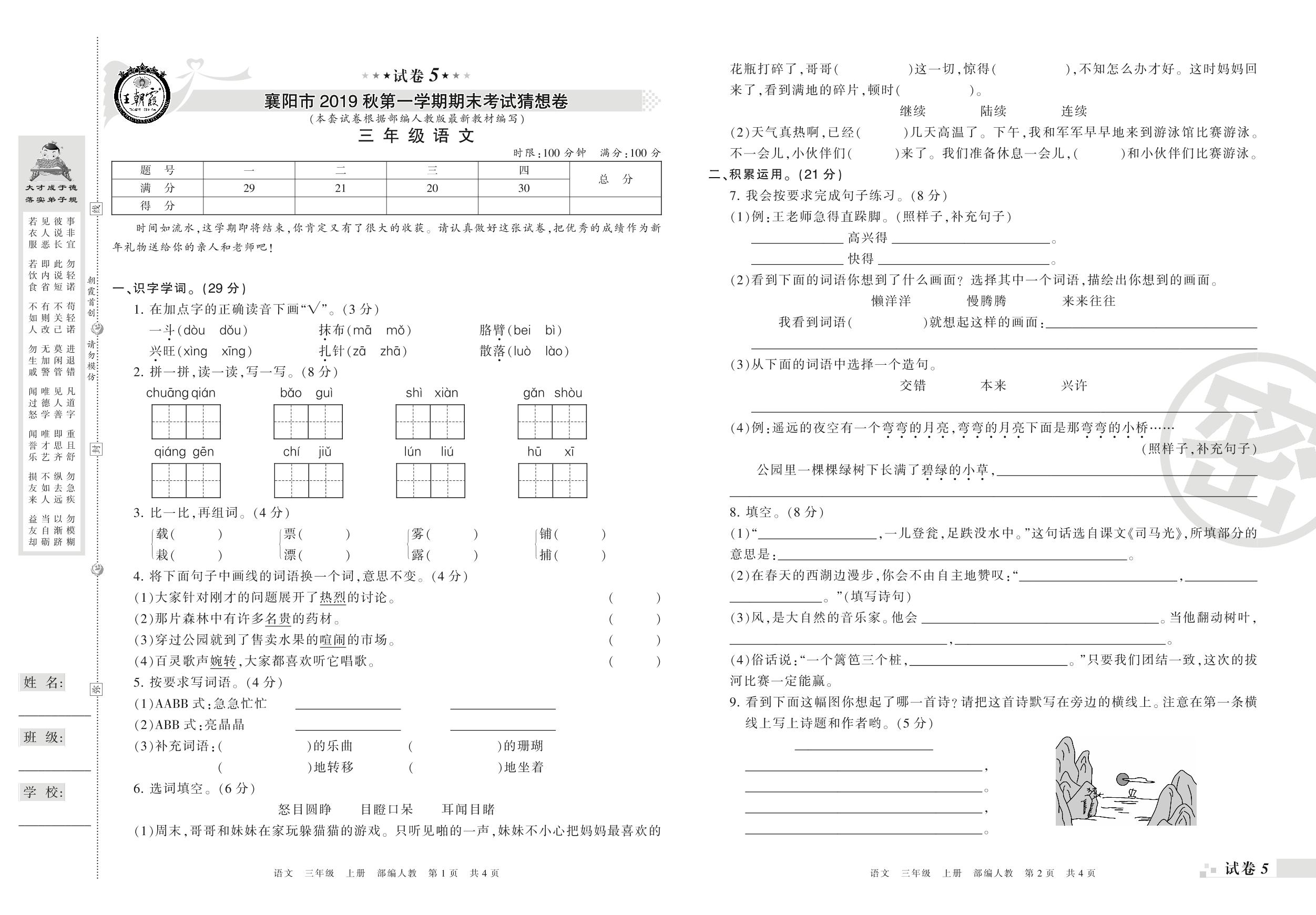 2018-2019学年第一学期襄阳市猜想卷三年级语文试卷(人教版)【5】