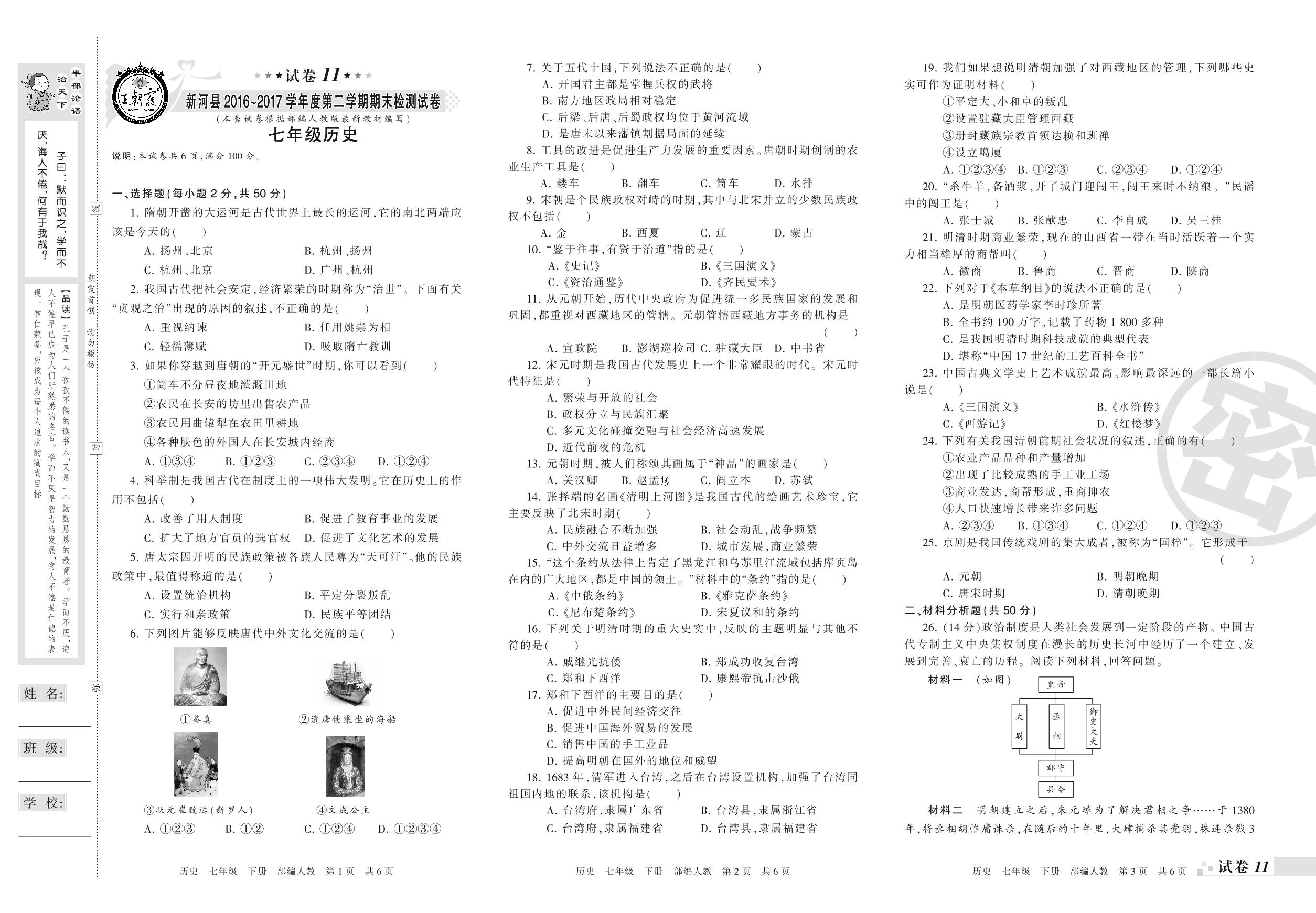 七年级历史人教版下册期末卷