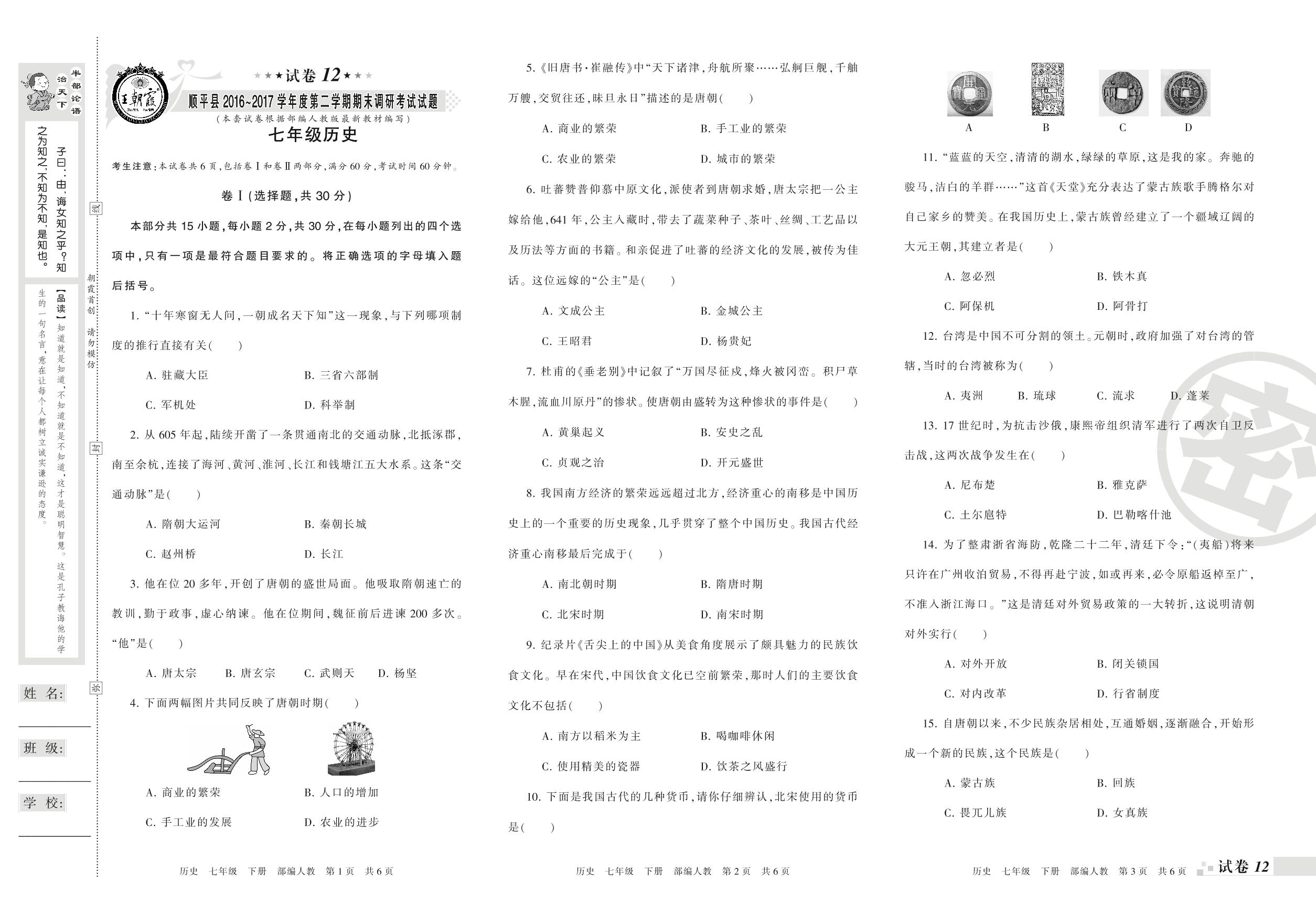 2016-2017学年第二学期保定市顺平县七年级历史试卷(人教版)【12】