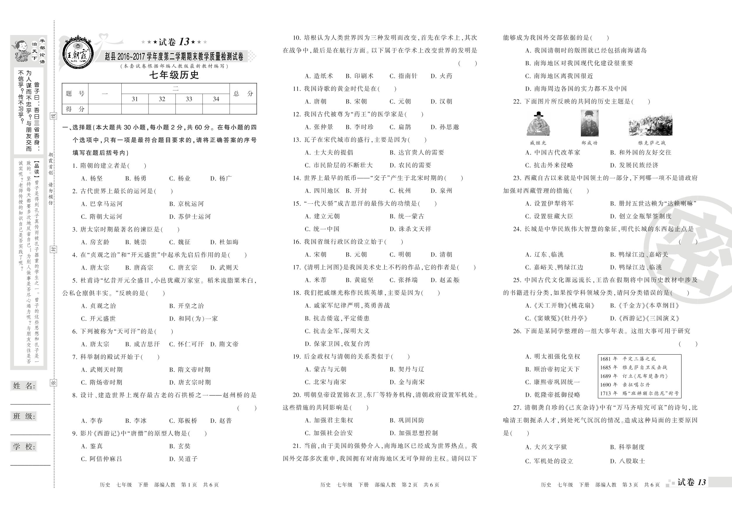 2016-2017学年第二学期石家庄市赵县七年级历史试卷(人教版)【13】