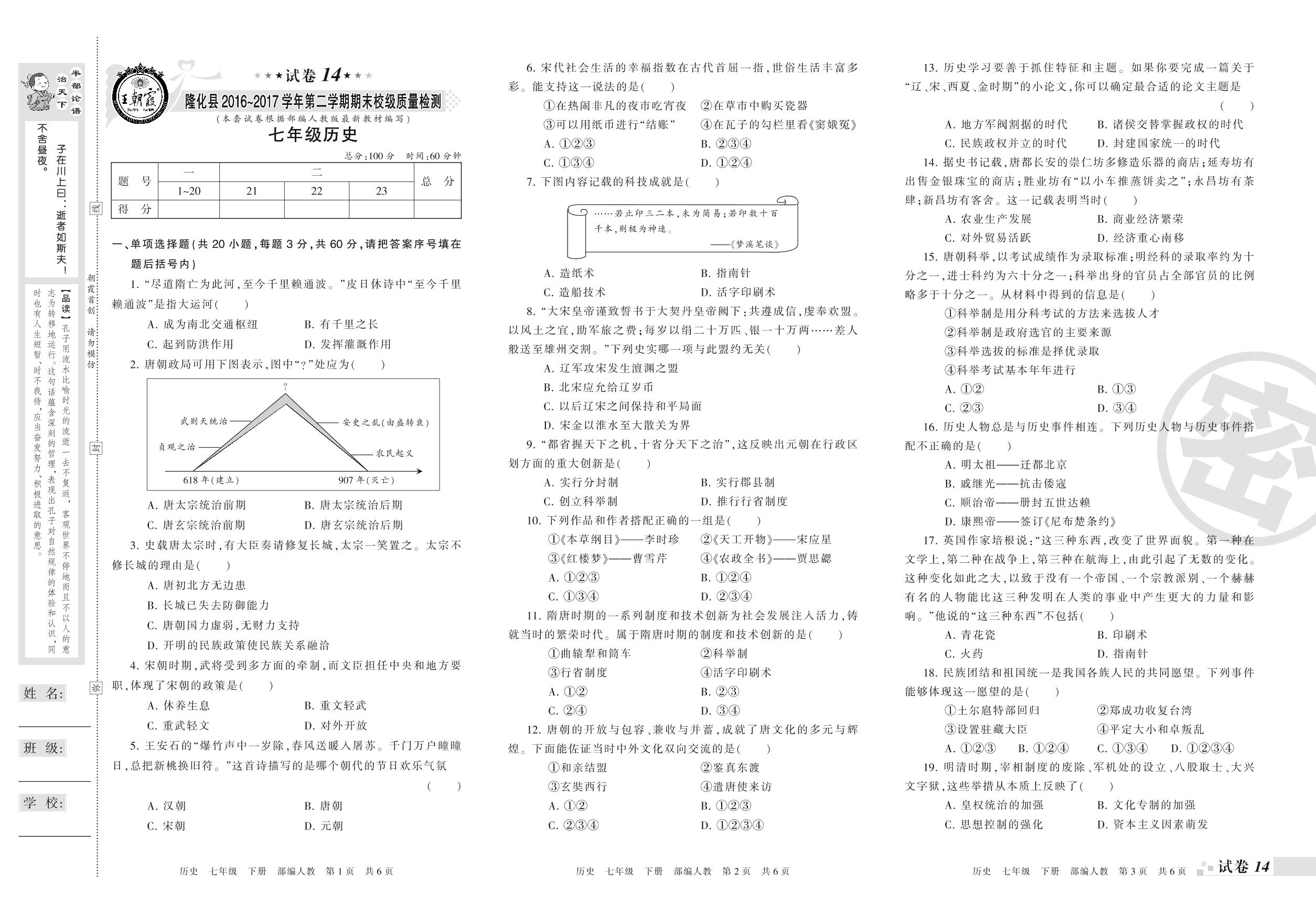 2016-2017学年第二学期承德市隆化县七年级历史试卷(人教版)【14】