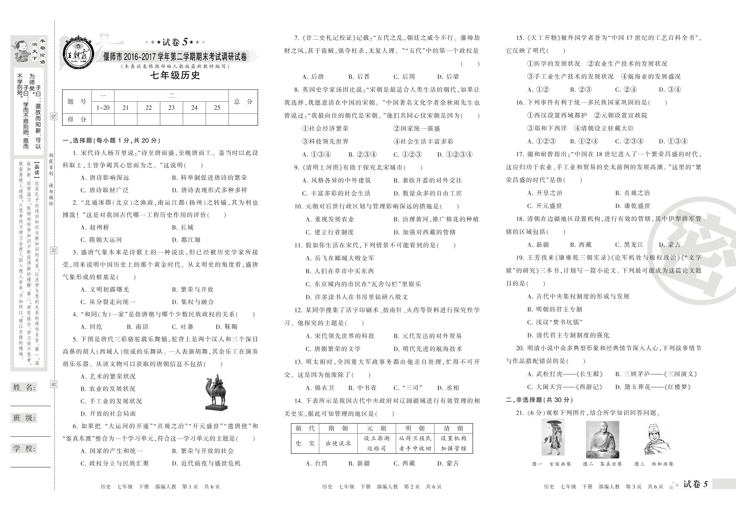 2016-2017学年第二学期偃师市七年级历史试卷(人教版)【5】