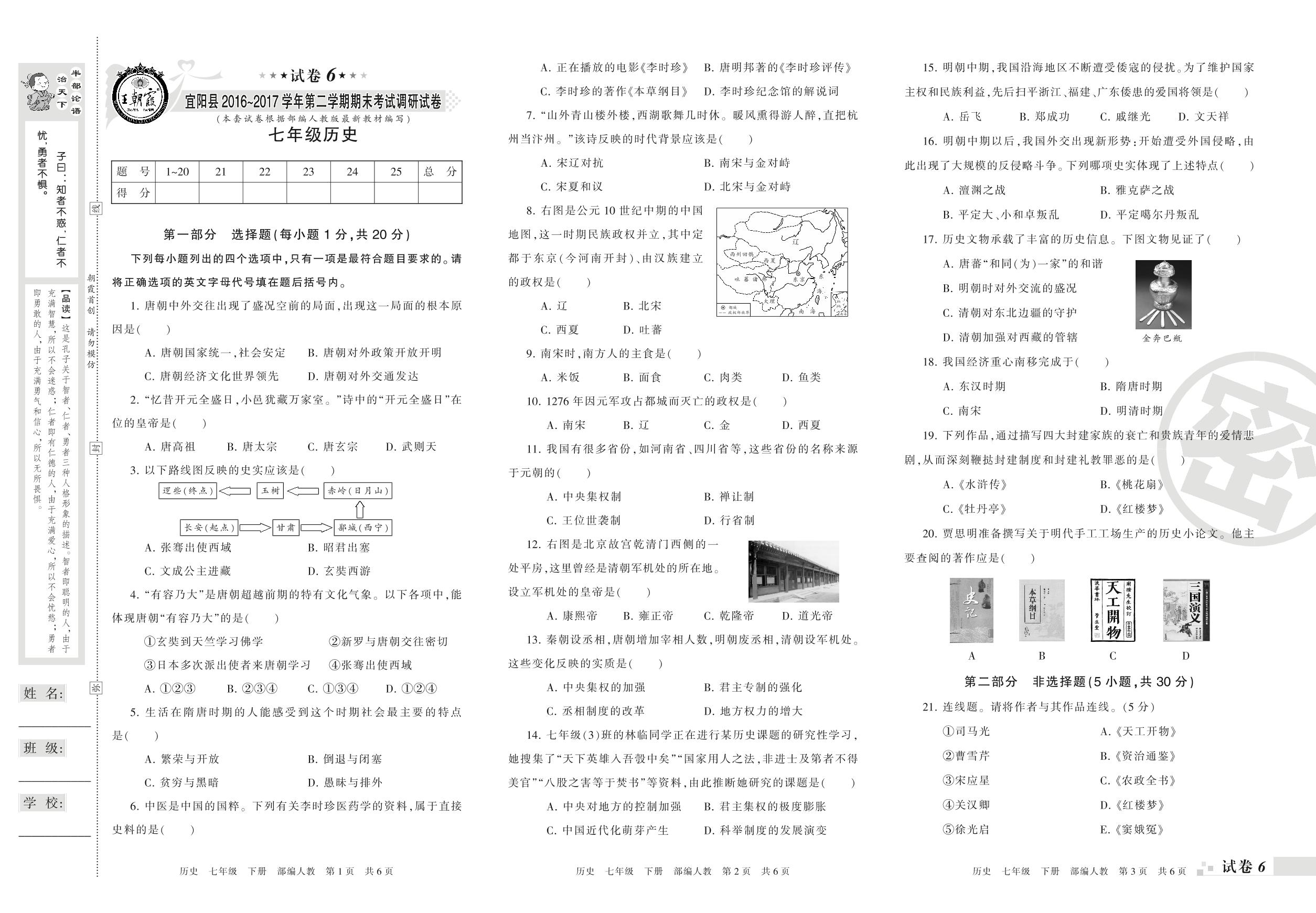 2016-2017学年第二学期洛阳市宜阳县七年级历史试卷(人教版)【6】