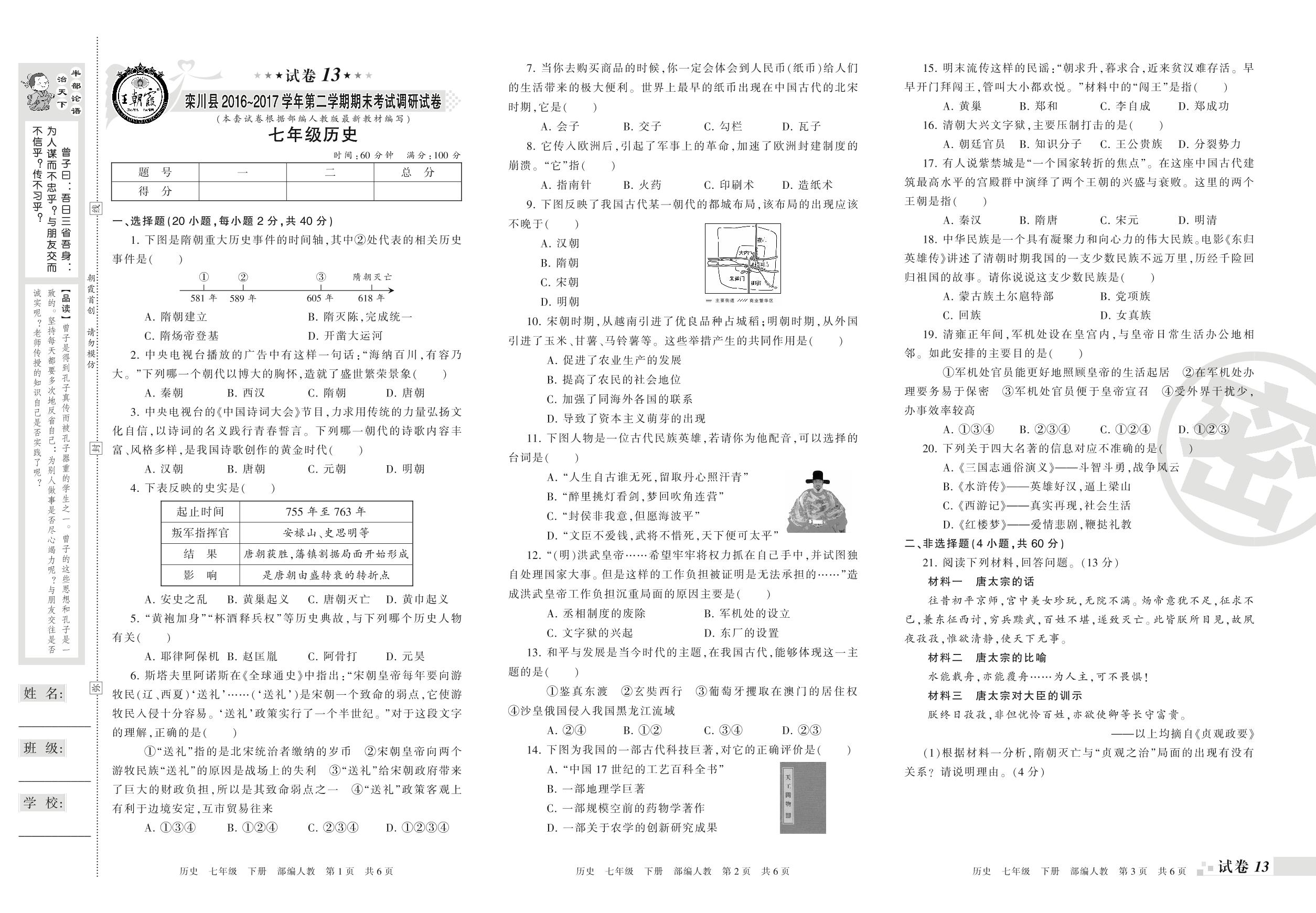 2016-2017学年第二学期洛阳市栾川县七年级历史试卷(人教版)【13】