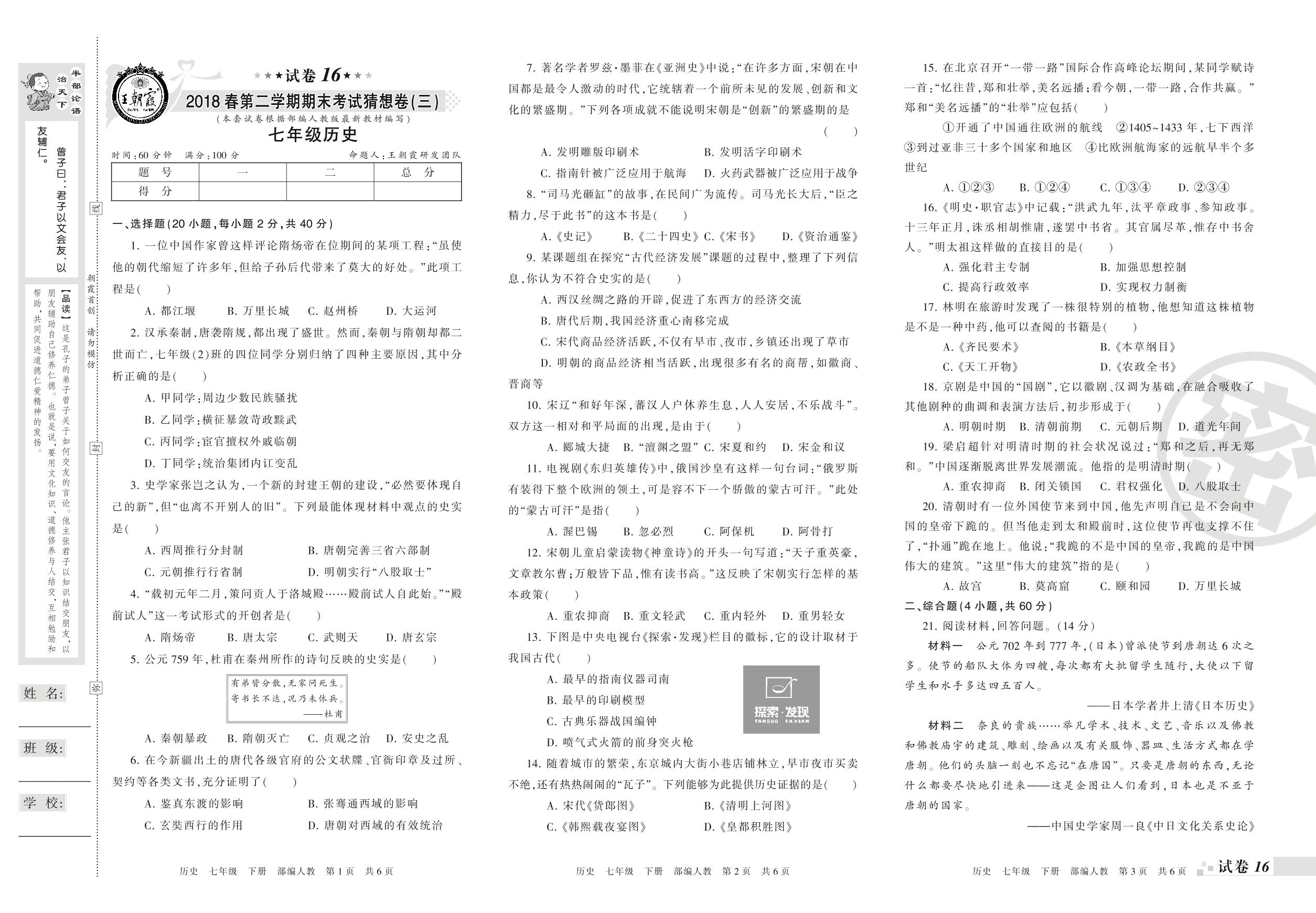 2017-2018学年第二学期期末考试猜想卷(三)七年级历史(人教版)【16】