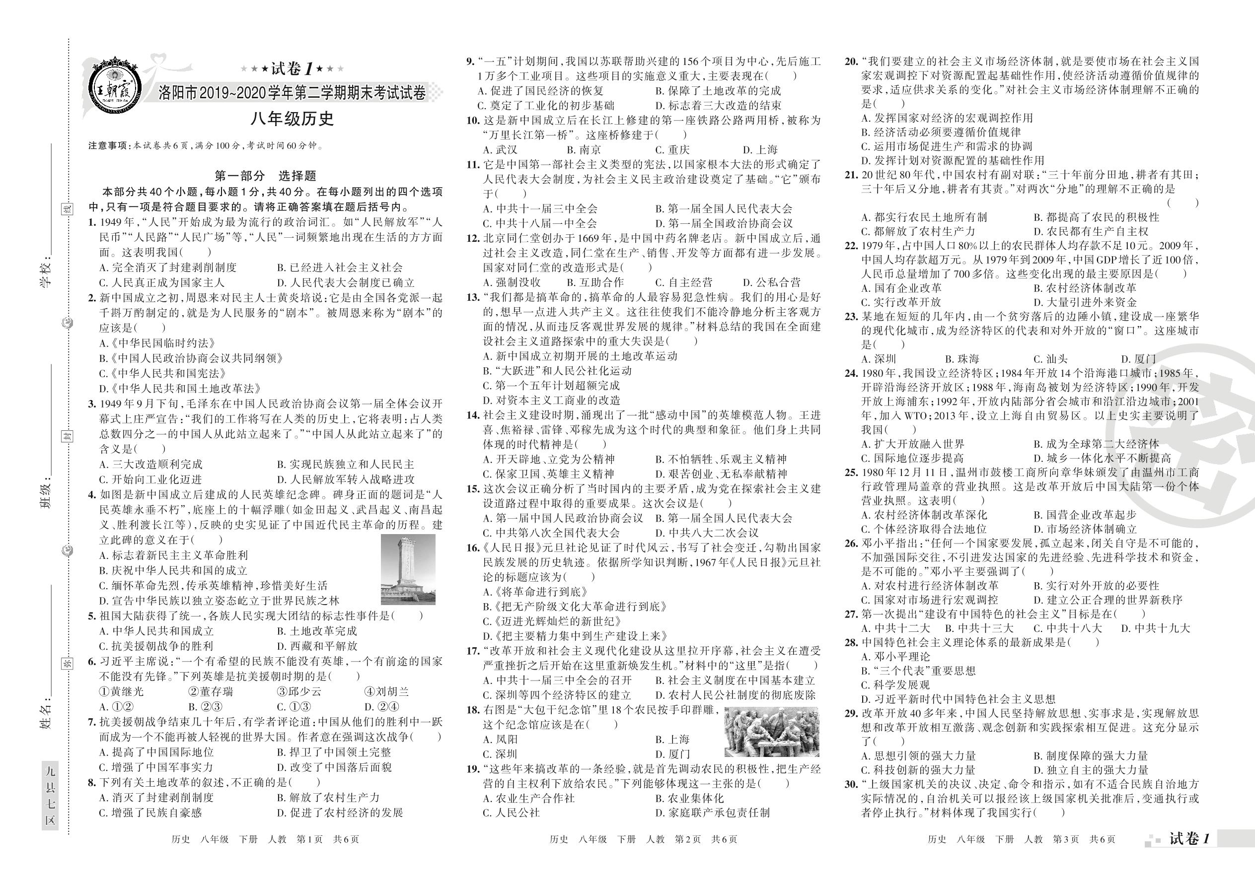 2019-2020学年第二学期洛阳市八年级历史试卷(人教版)【1】