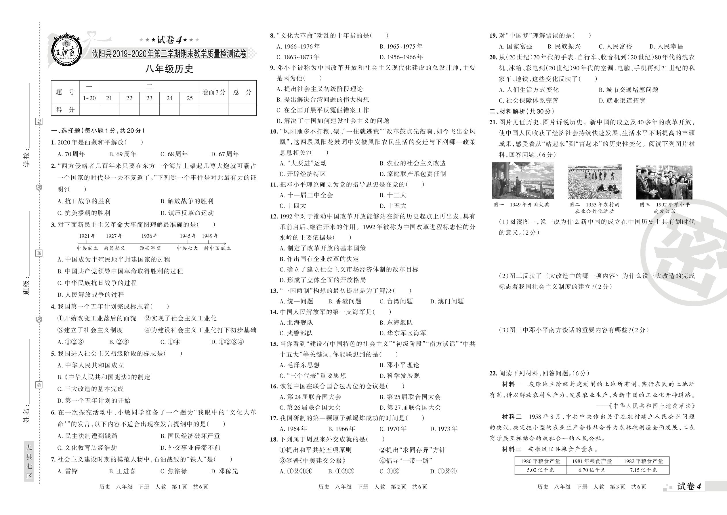2019-2020学年第二学期洛阳市汝阳县八年级历史试卷(人教版)【4】