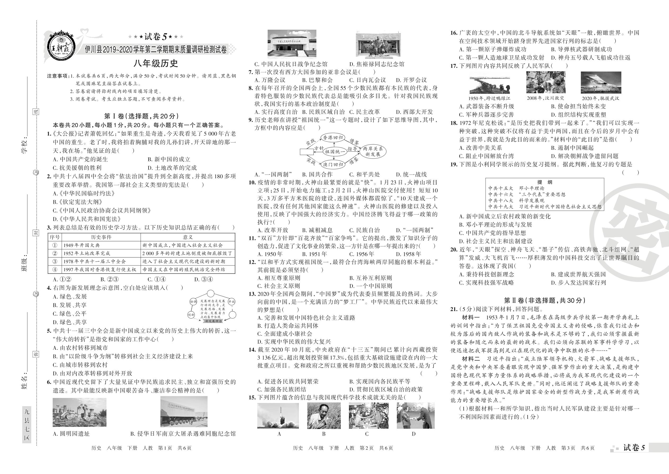 2019-2020学年第二学期洛阳市伊川县八年级历史试卷(人教版)【5】