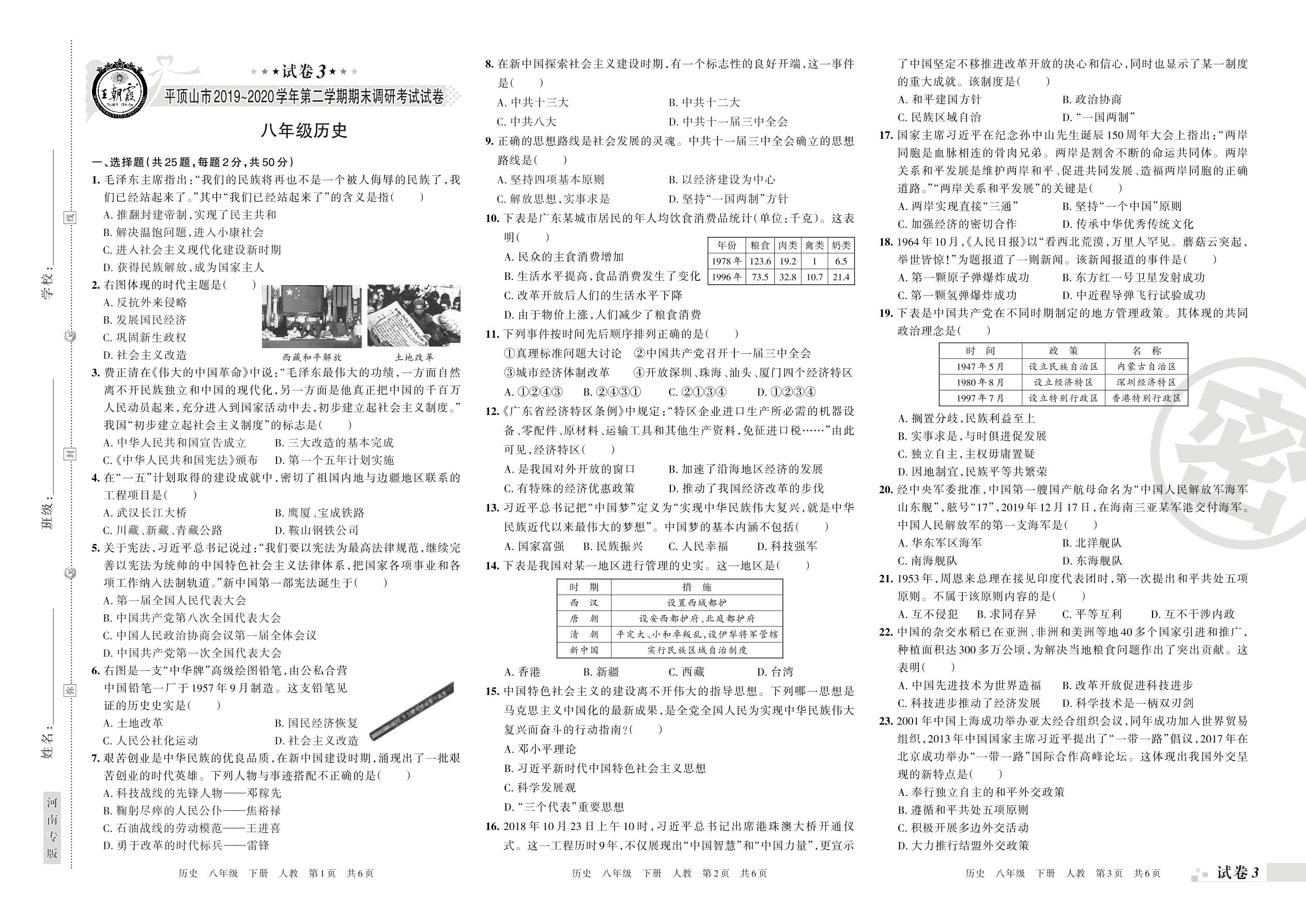 2019-2020学年第二学期平顶山市八年级历史试卷(人教版)【3】