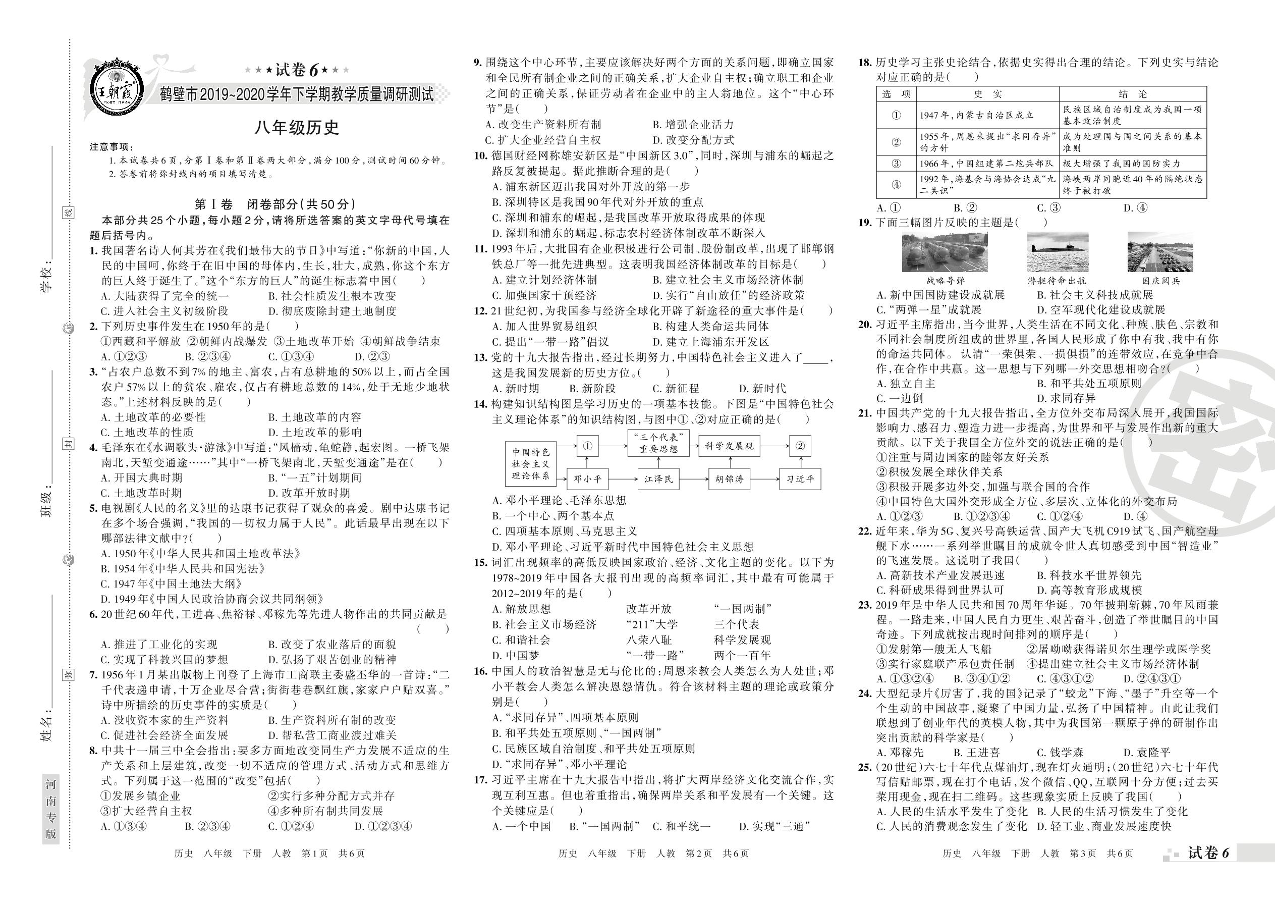 2019-2020学年第二学期鹤壁市八年级历史试卷(人教版)【6】
