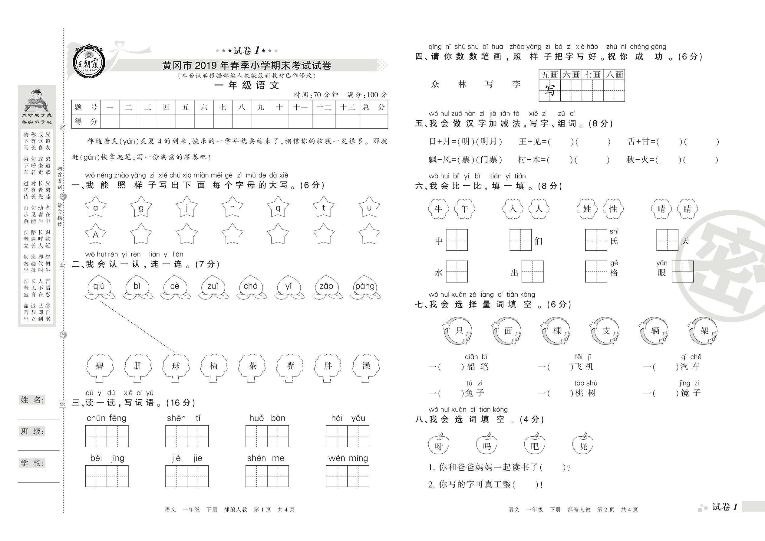 2018-2019学年第二学期黄冈市一年级语文试卷(人教版)【1】