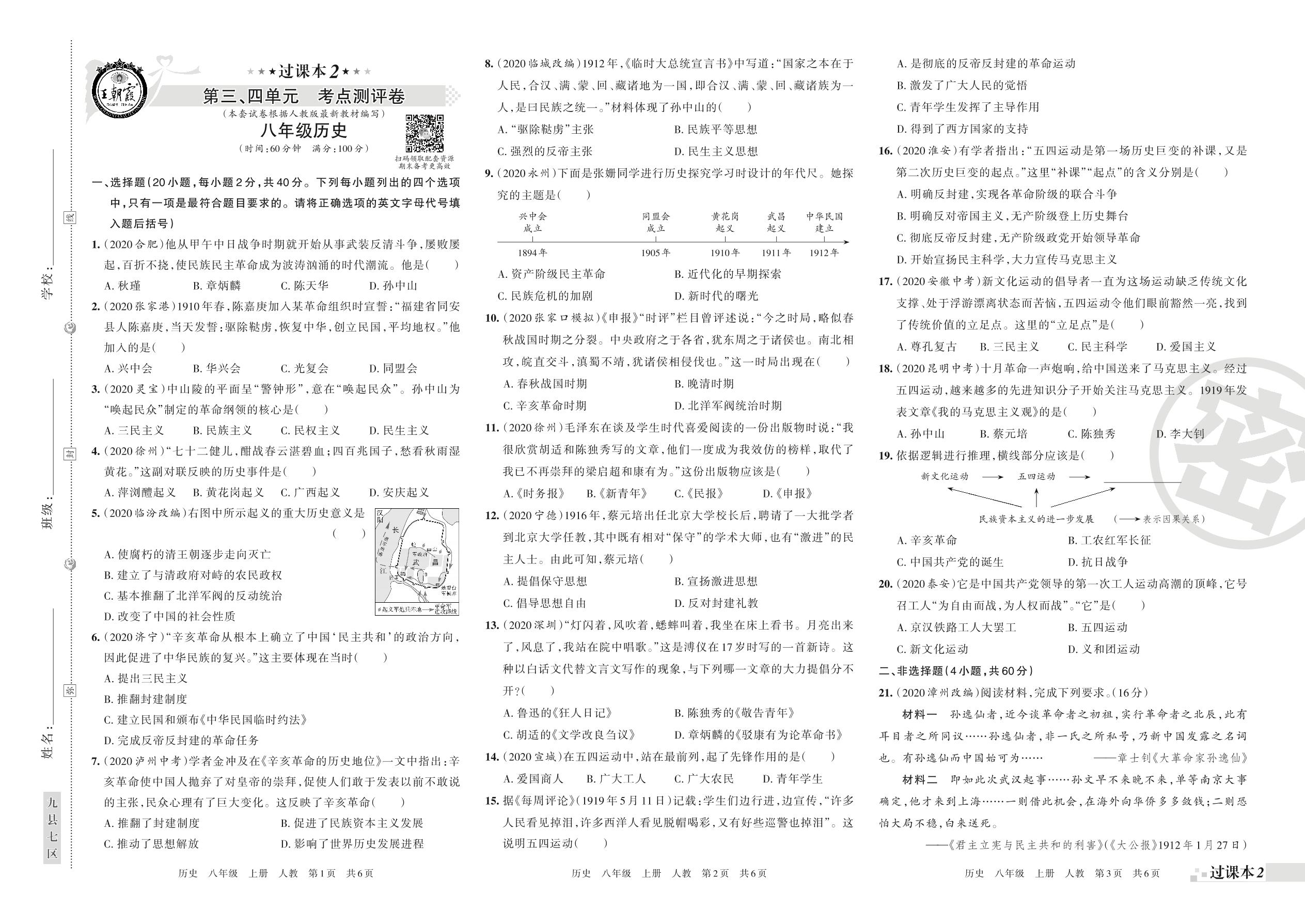 王朝霞期末过课本——第三、四单元考点测评八年级上册历史(人教版)_R210810115025【0】