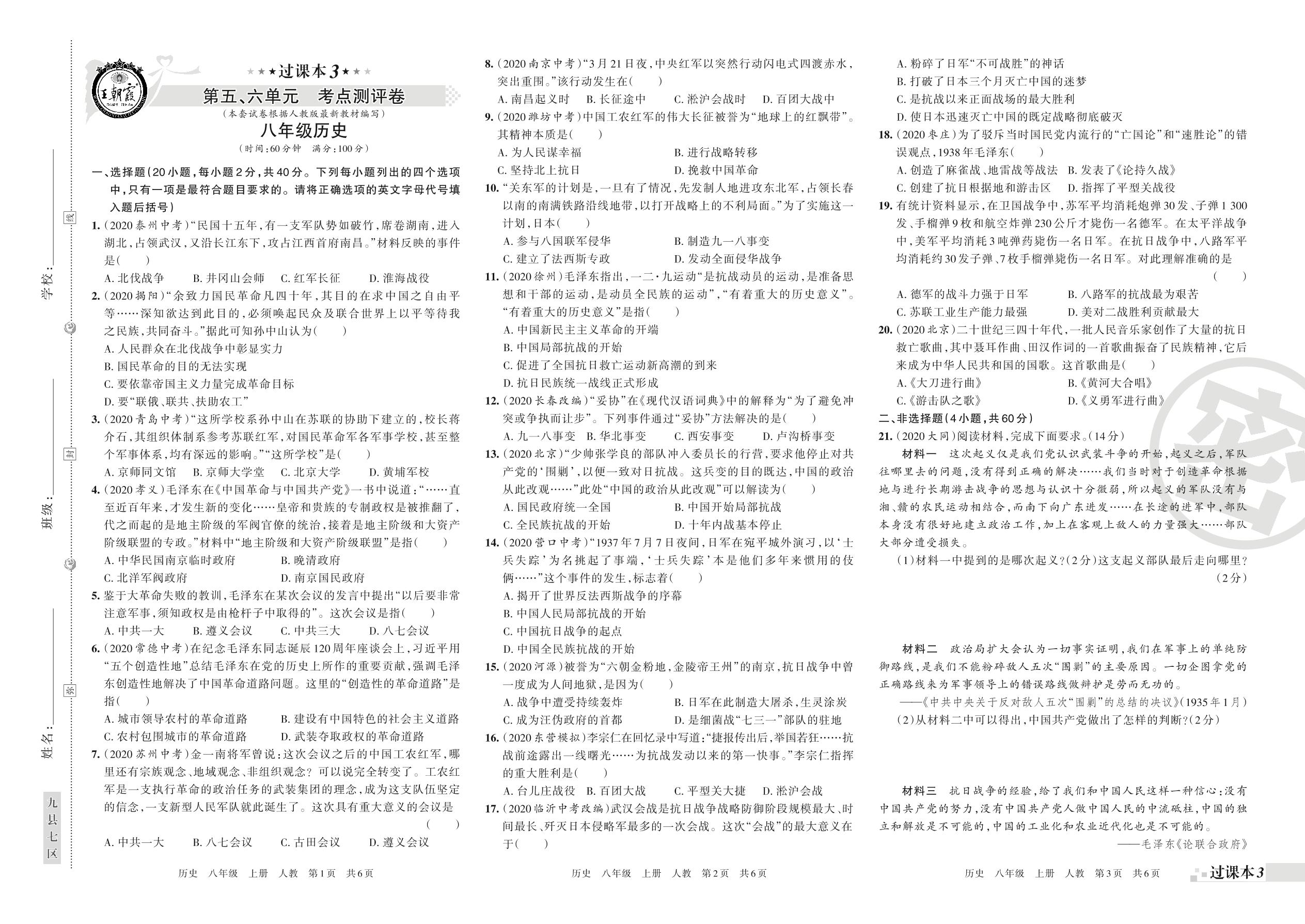 王朝霞期末过课本——第五、六单元考点测评八年级上册历史(人教版)_R210810115033【0】