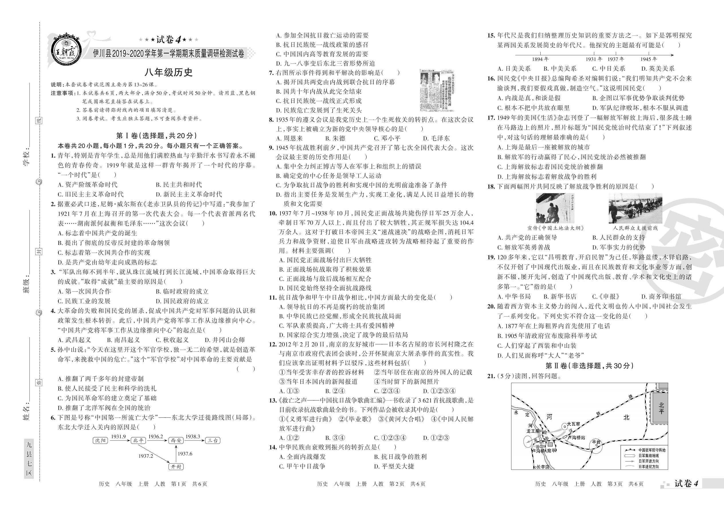 2019-2020学年第一学期洛阳市伊川县八年级历史试卷(人教版)【4】
