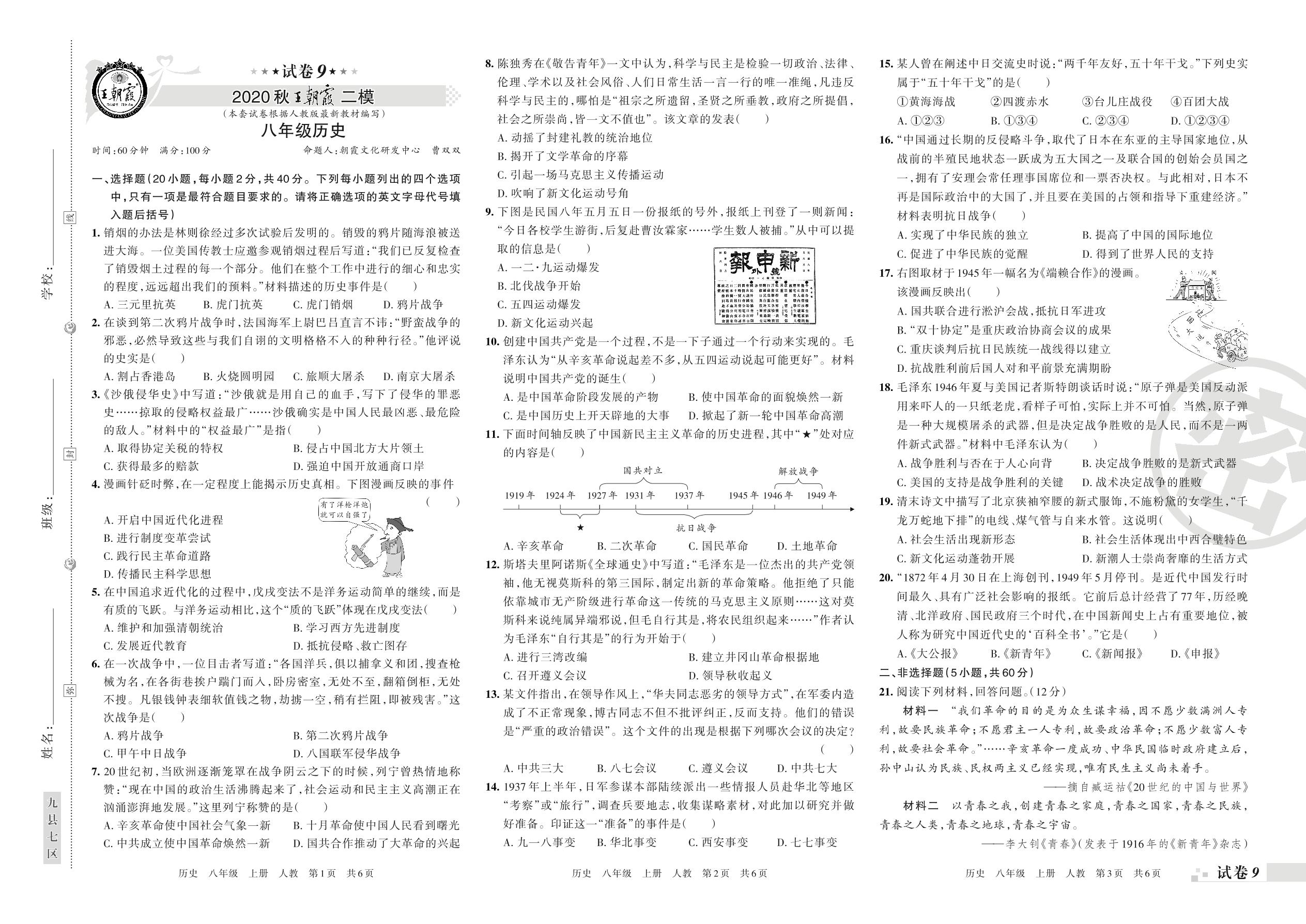 王朝霞期末模拟卷八年级上册历史(人教版)【9】