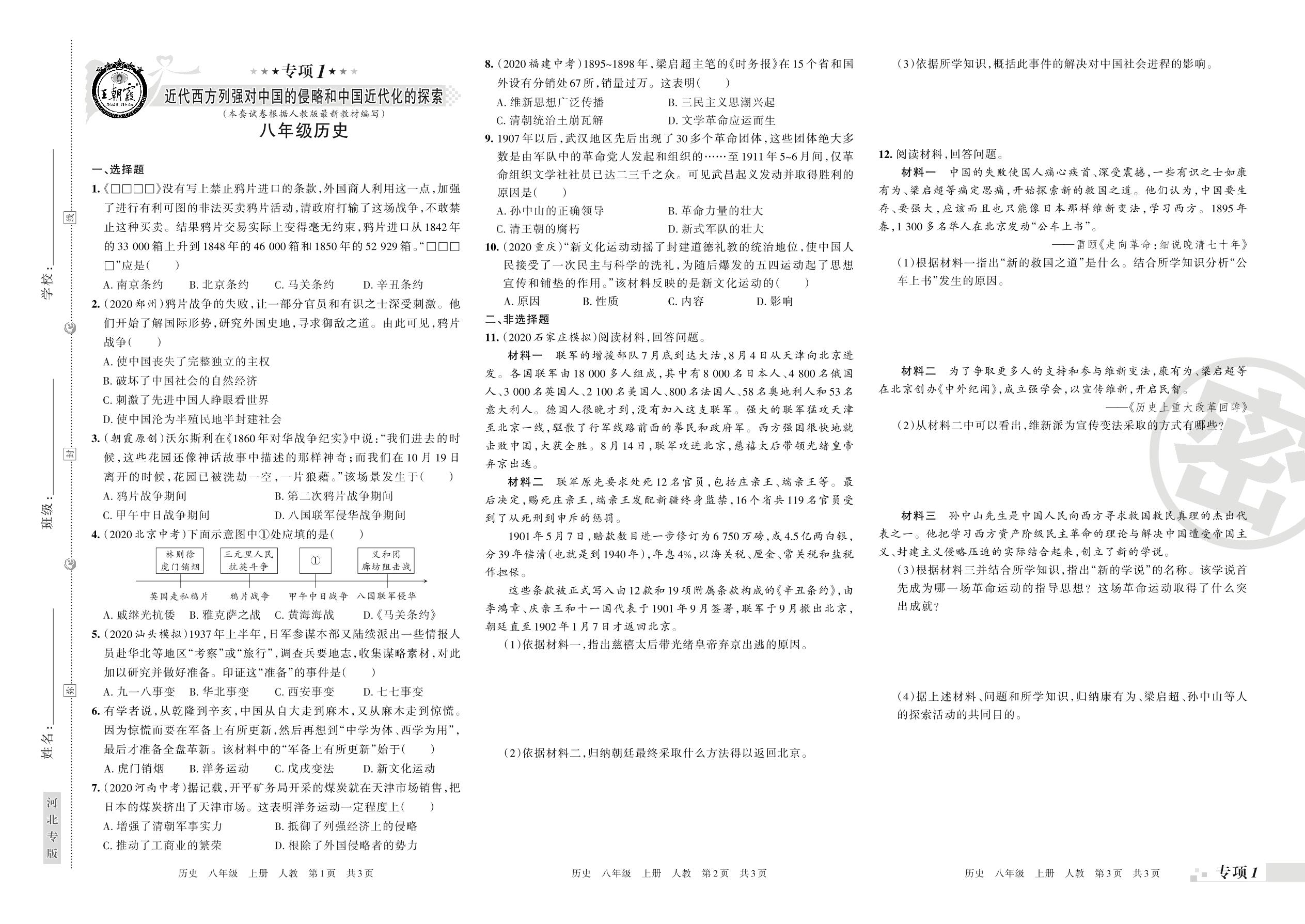 王朝霞期末专项卷——近代西方列强对中国的侵略和中国近代化的探索、新民主主义革命发展历程八年级上册历史(人教版)【0】