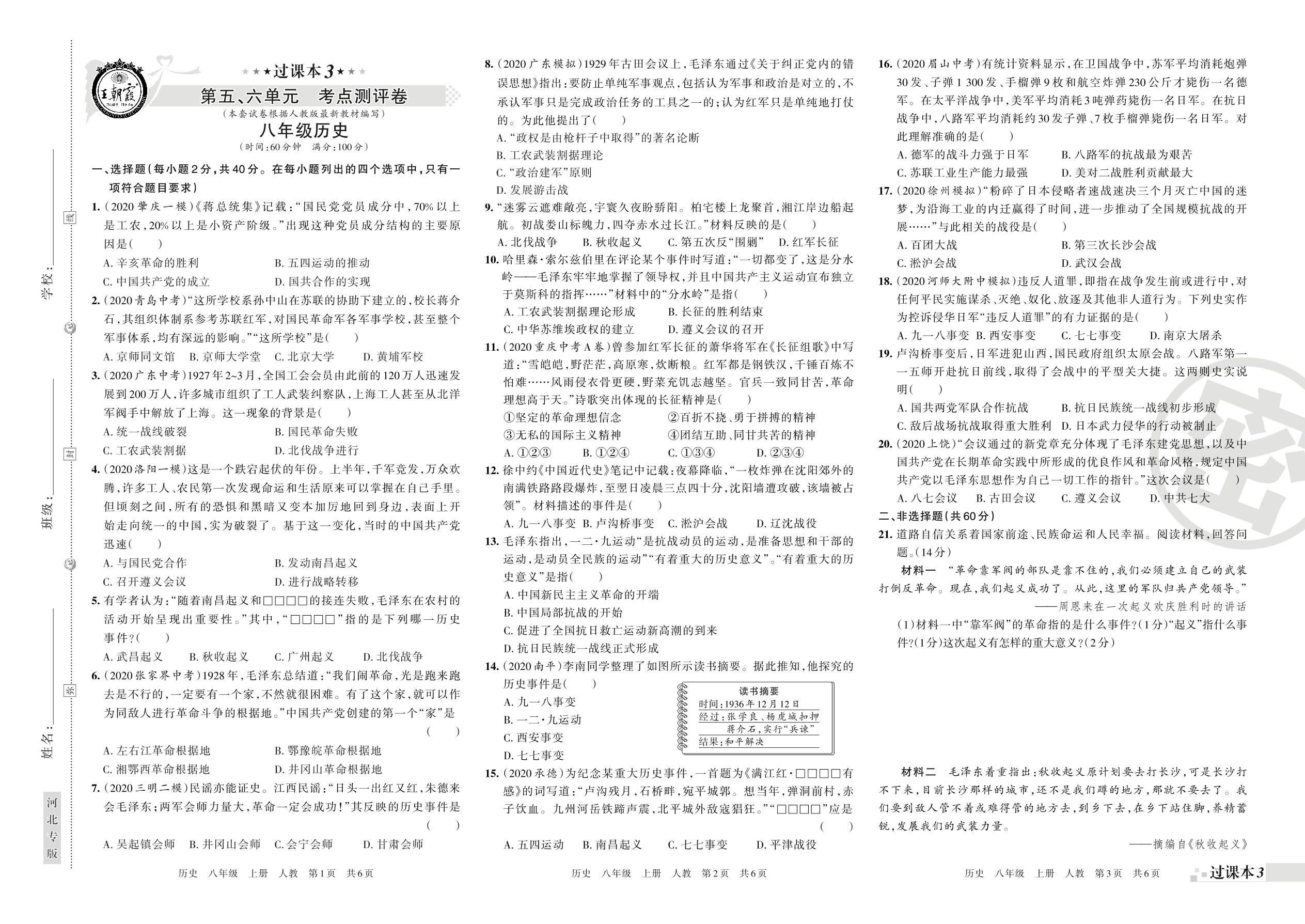王朝霞期末过课本——第五、六单元考点测评八年级上册历史(人教版)【0】
