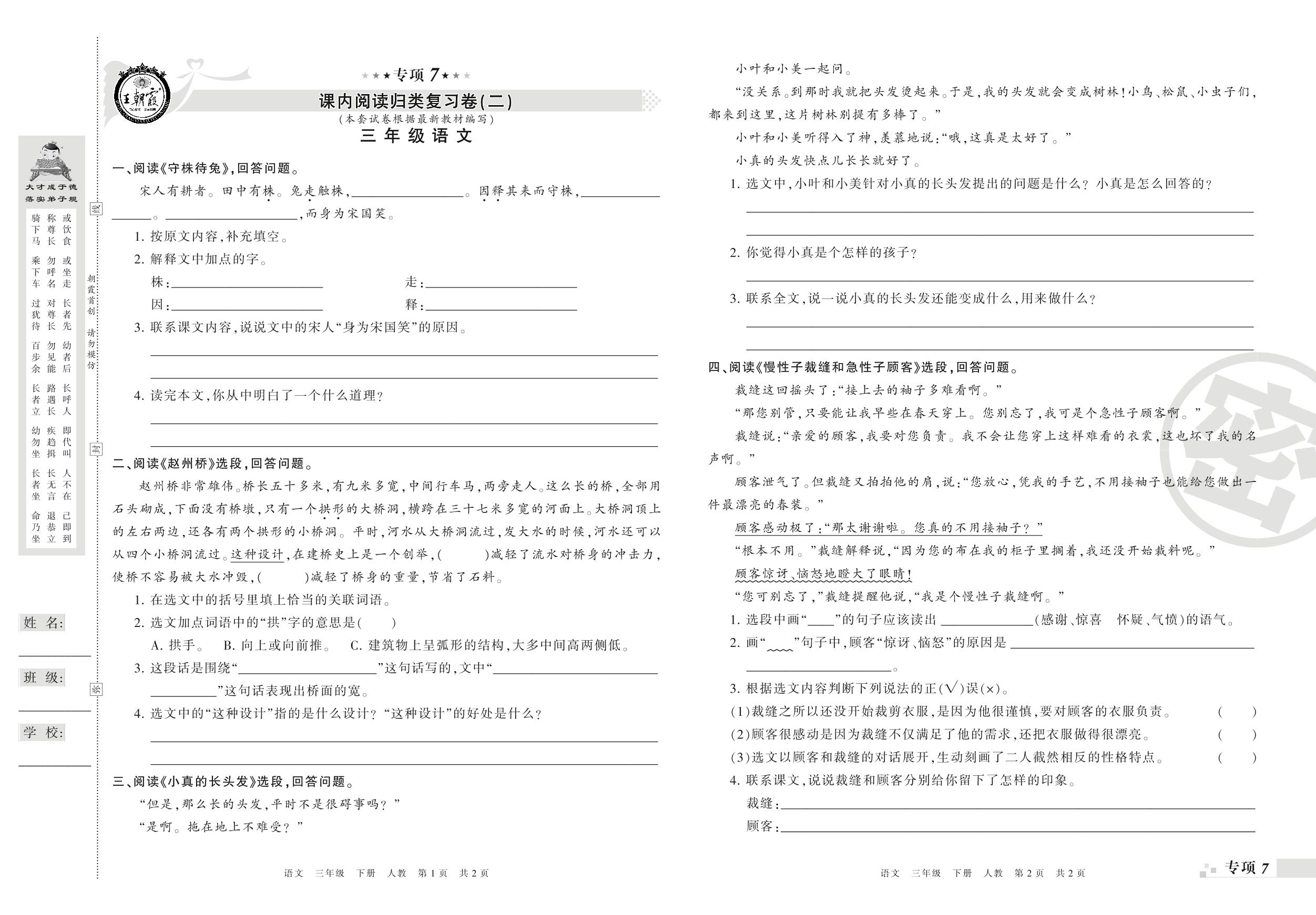 王朝霞期末专项卷——课内阅读、课外阅读与写作归类复习三年级下册语文(人教版)【0】