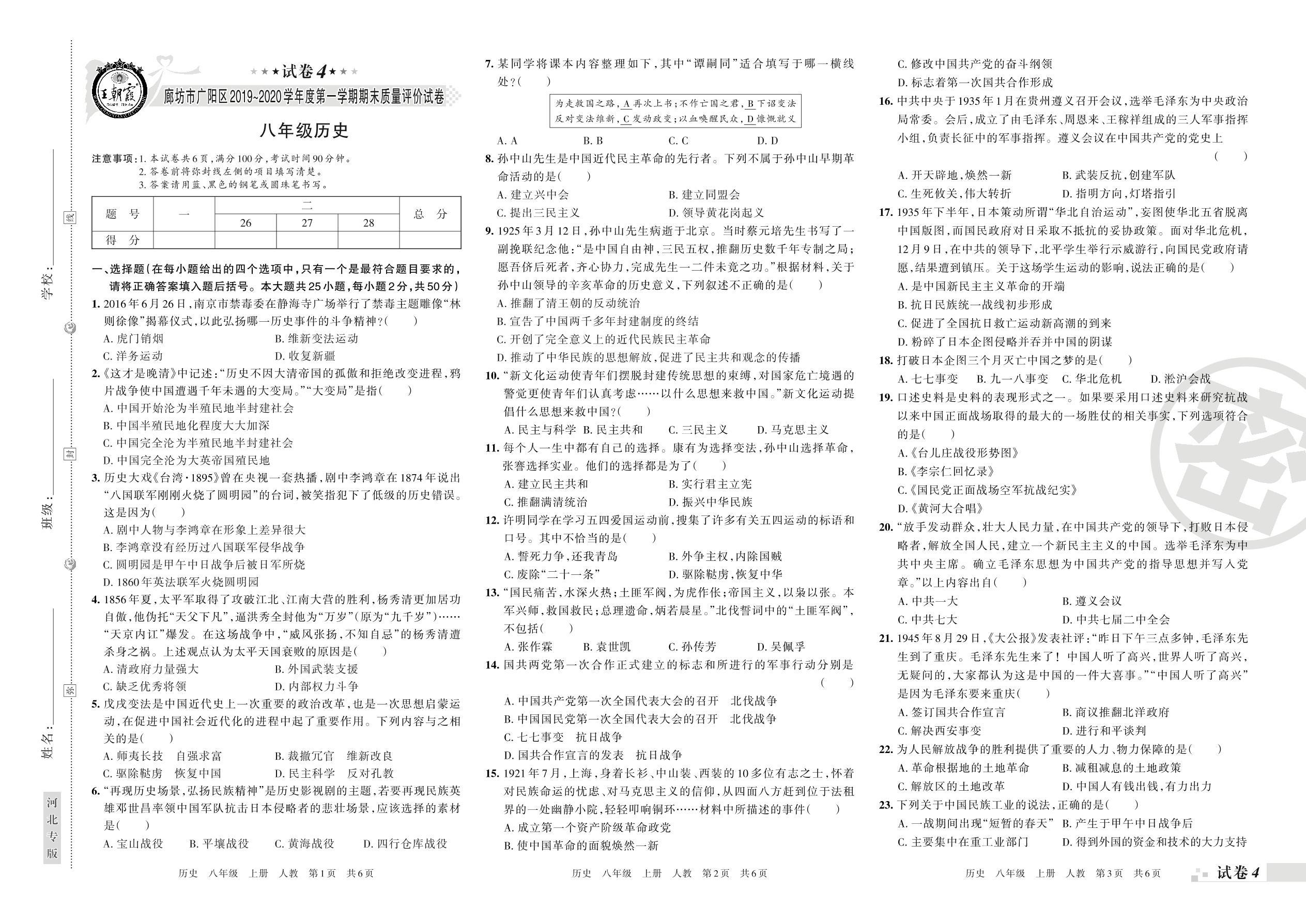 2019-2020学年第一学期廊坊市广阳区八年级历史试卷(人教版)【4】