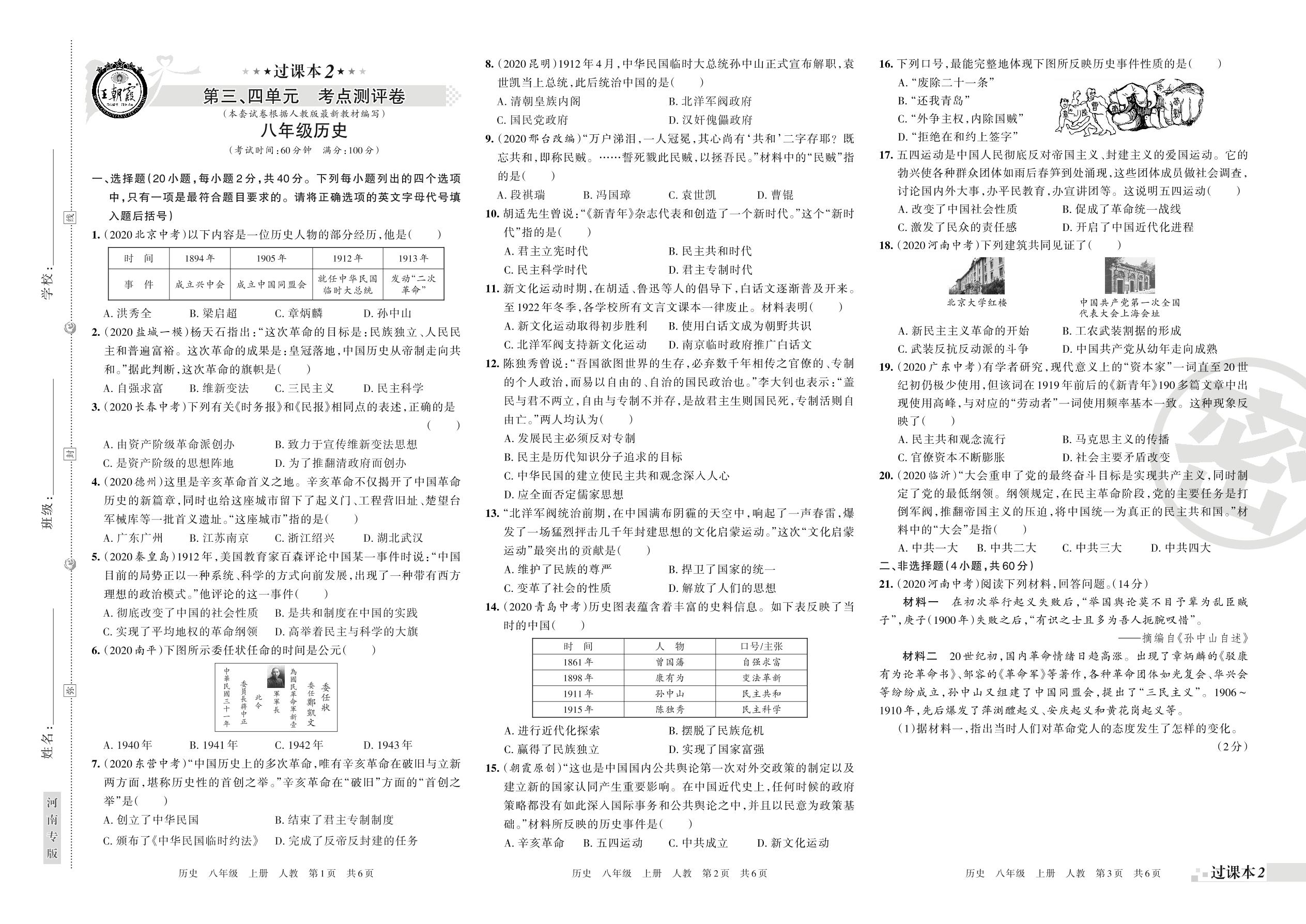 王朝霞期末过课本——第三、四单元考点测评八年级上册历史(人教版)_R210810115417【0】