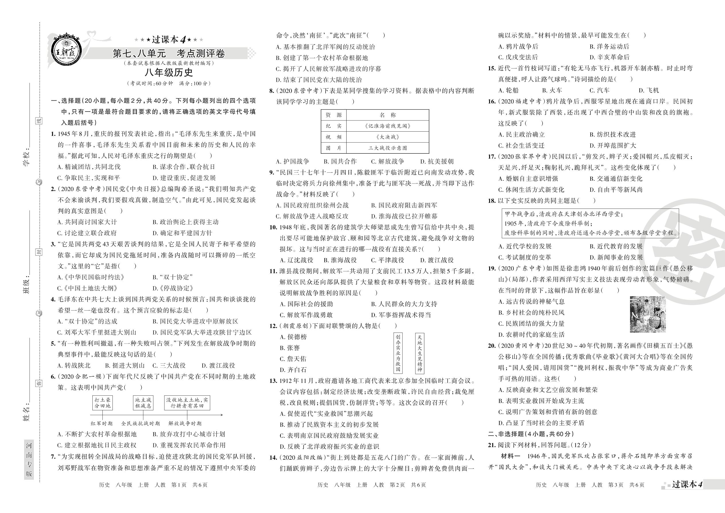 王朝霞期末过课本——第七、八单元考点测评八年级上册历史(人教版)_R210810115435【0】