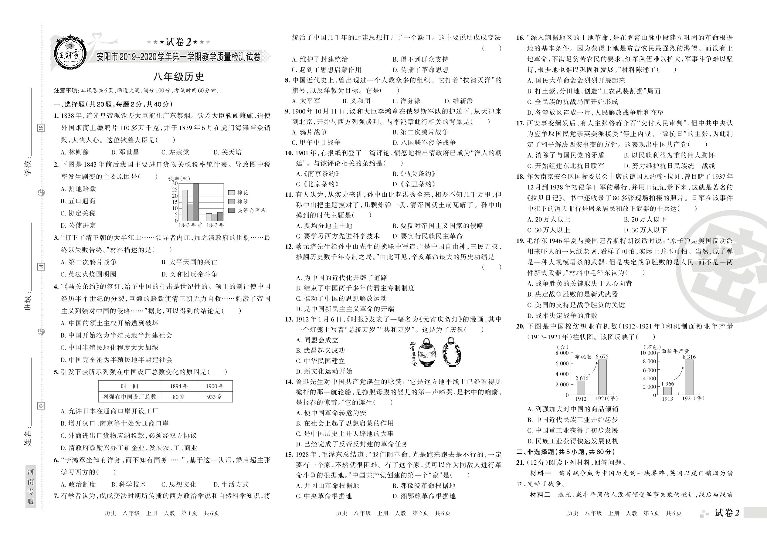 2019-2020学年第一学期安阳市八年级历史试卷(人教版)【2】