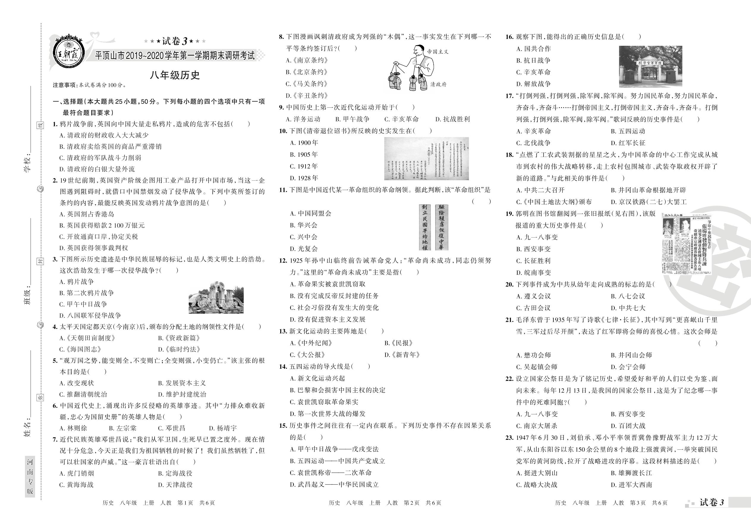 2019-2020学年第一学期平顶山市八年级历史试卷(人教版)【3】