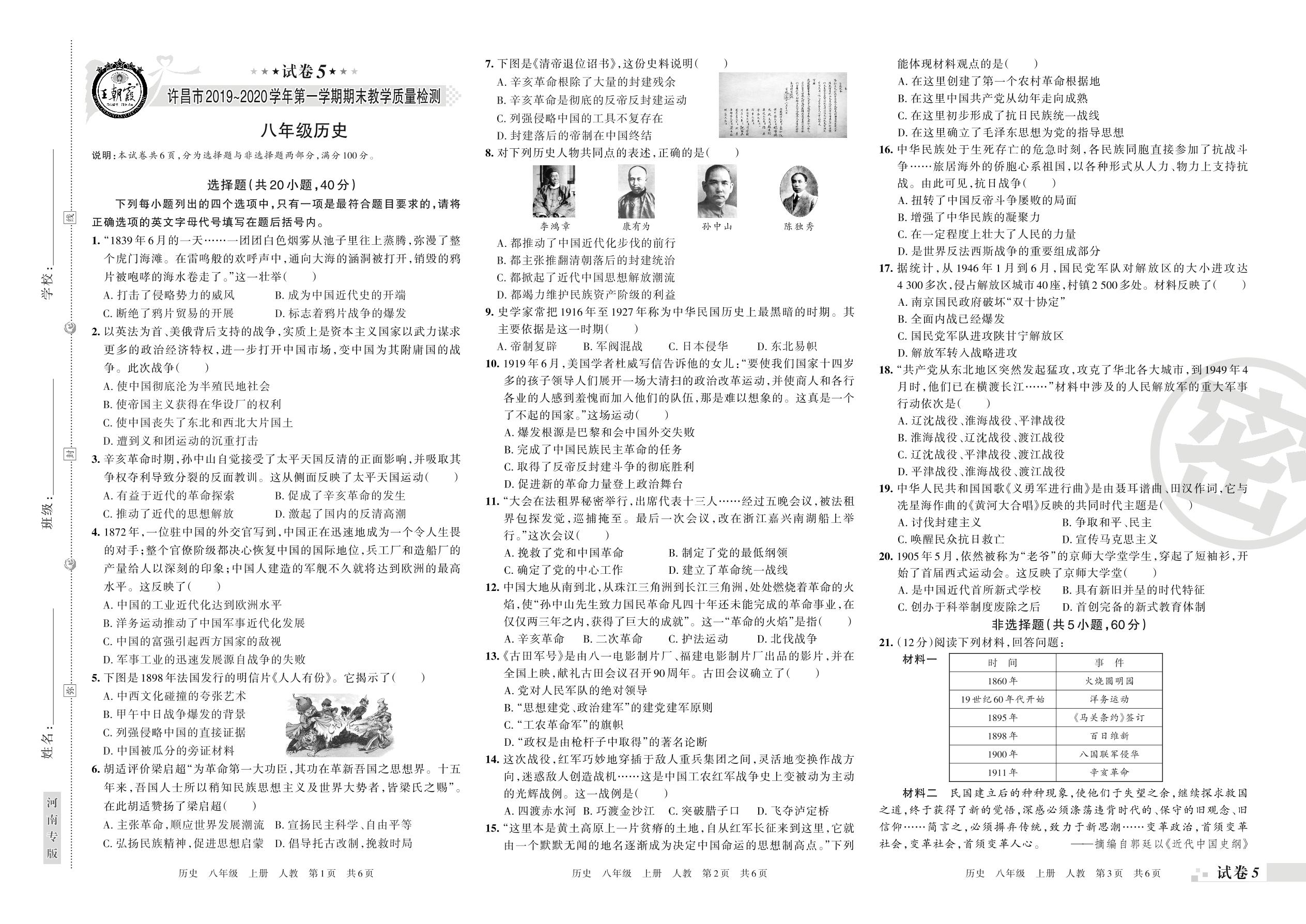 2019-2020学年第一学期许昌市八年级历史试卷(人教版)【5】
