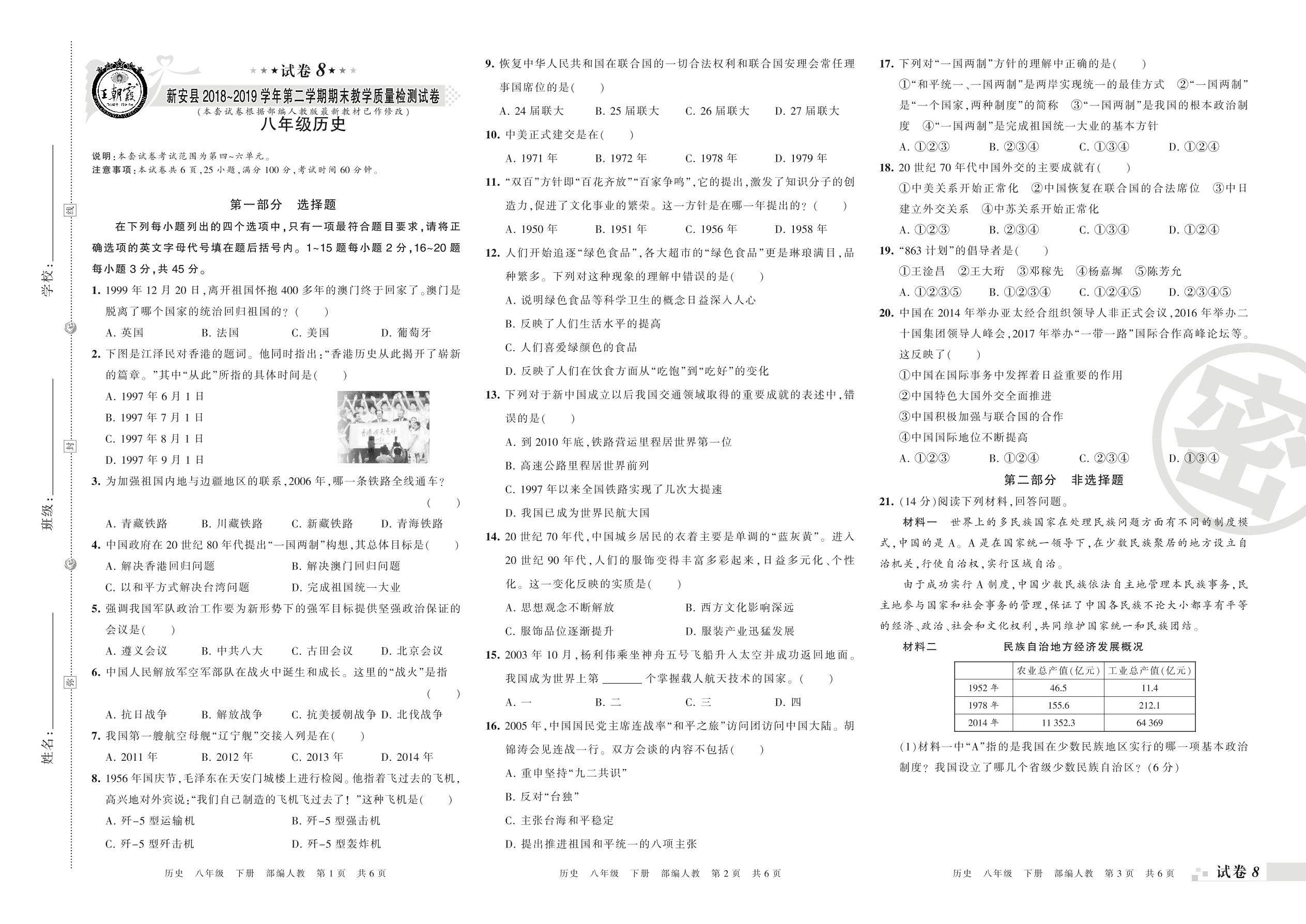 2018-2019学年第二学期新安县八年级历史试卷(人教版)【8】