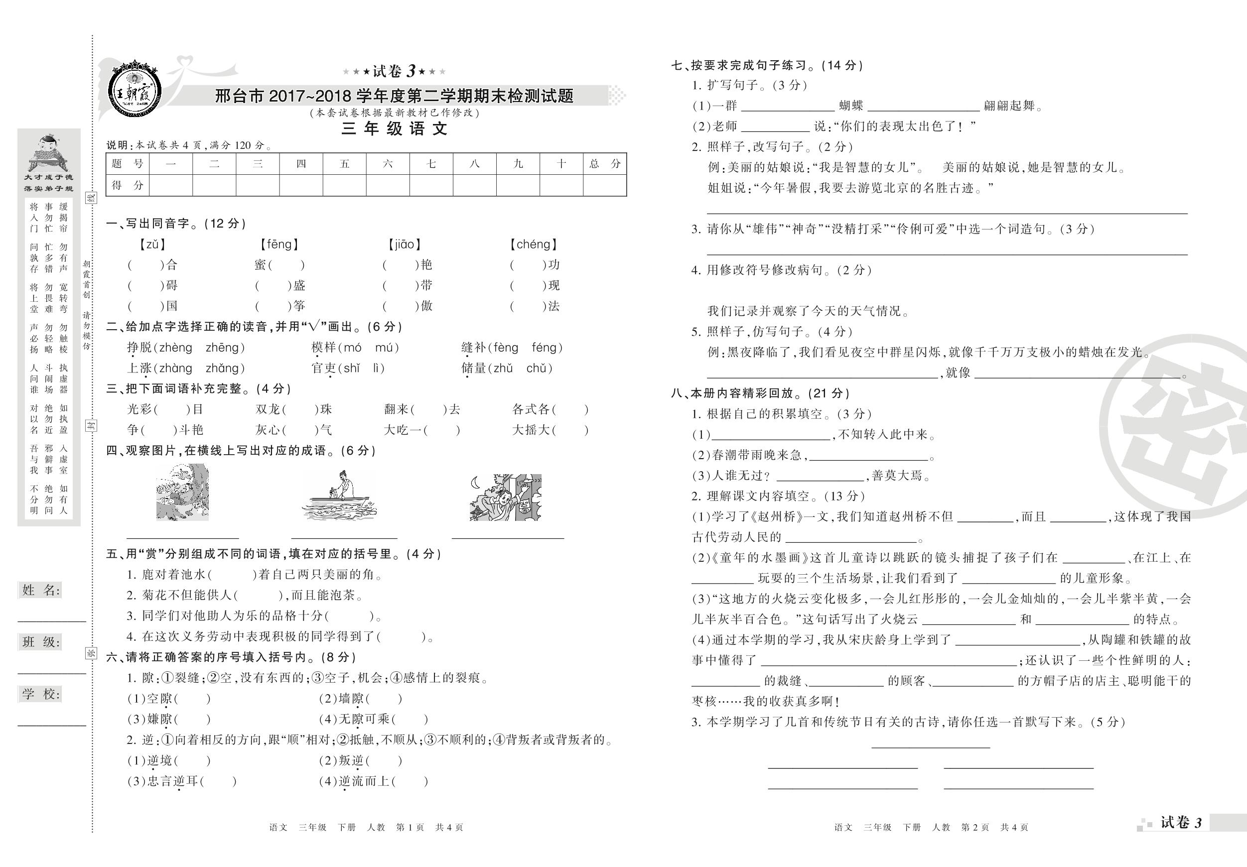 2017-2018学年第二学期邢台市三年级语文试卷(人教版)【3】