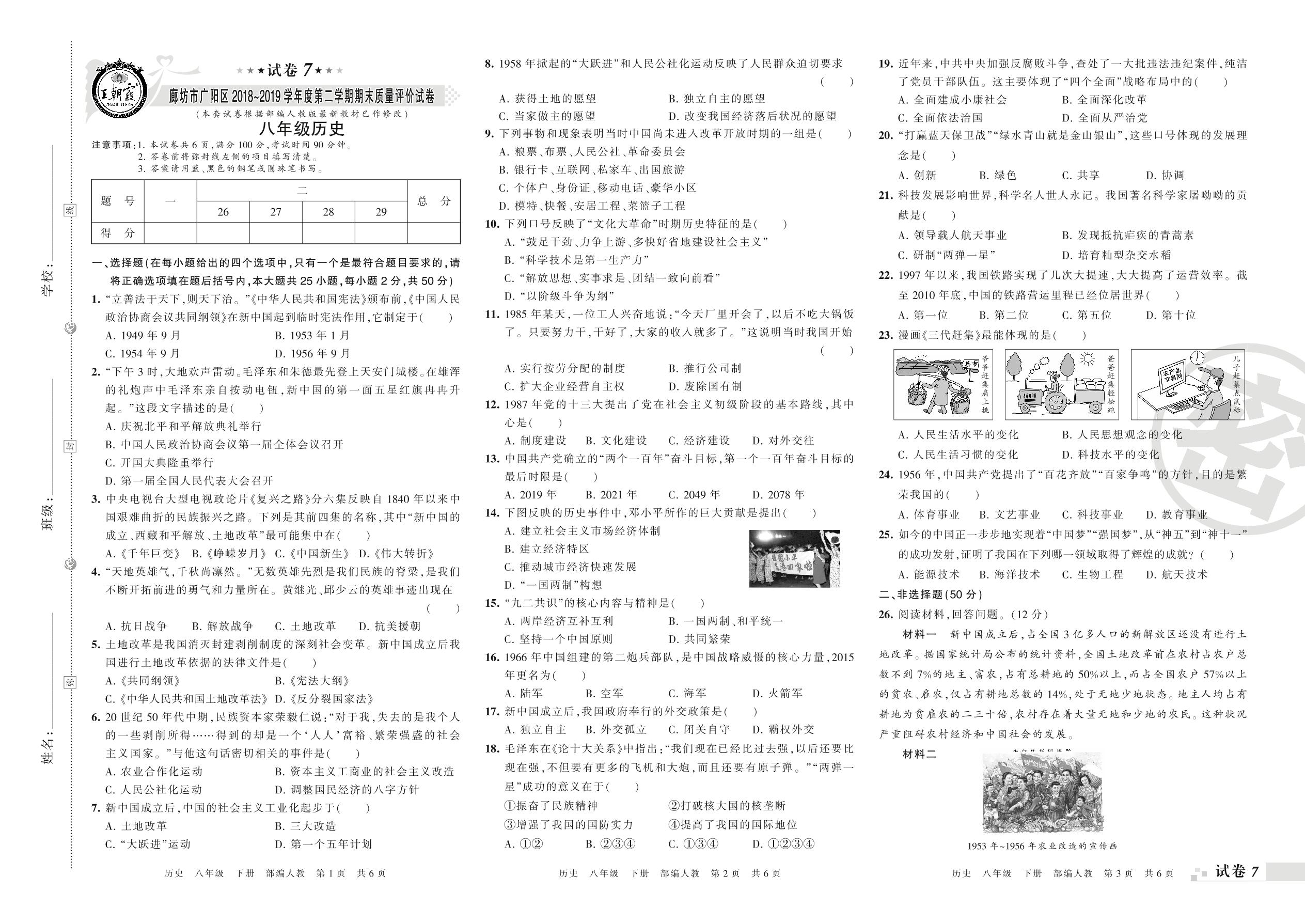 2018-2019学年第二学期廊坊市广阳区八年级历史试卷(人教版)【7】