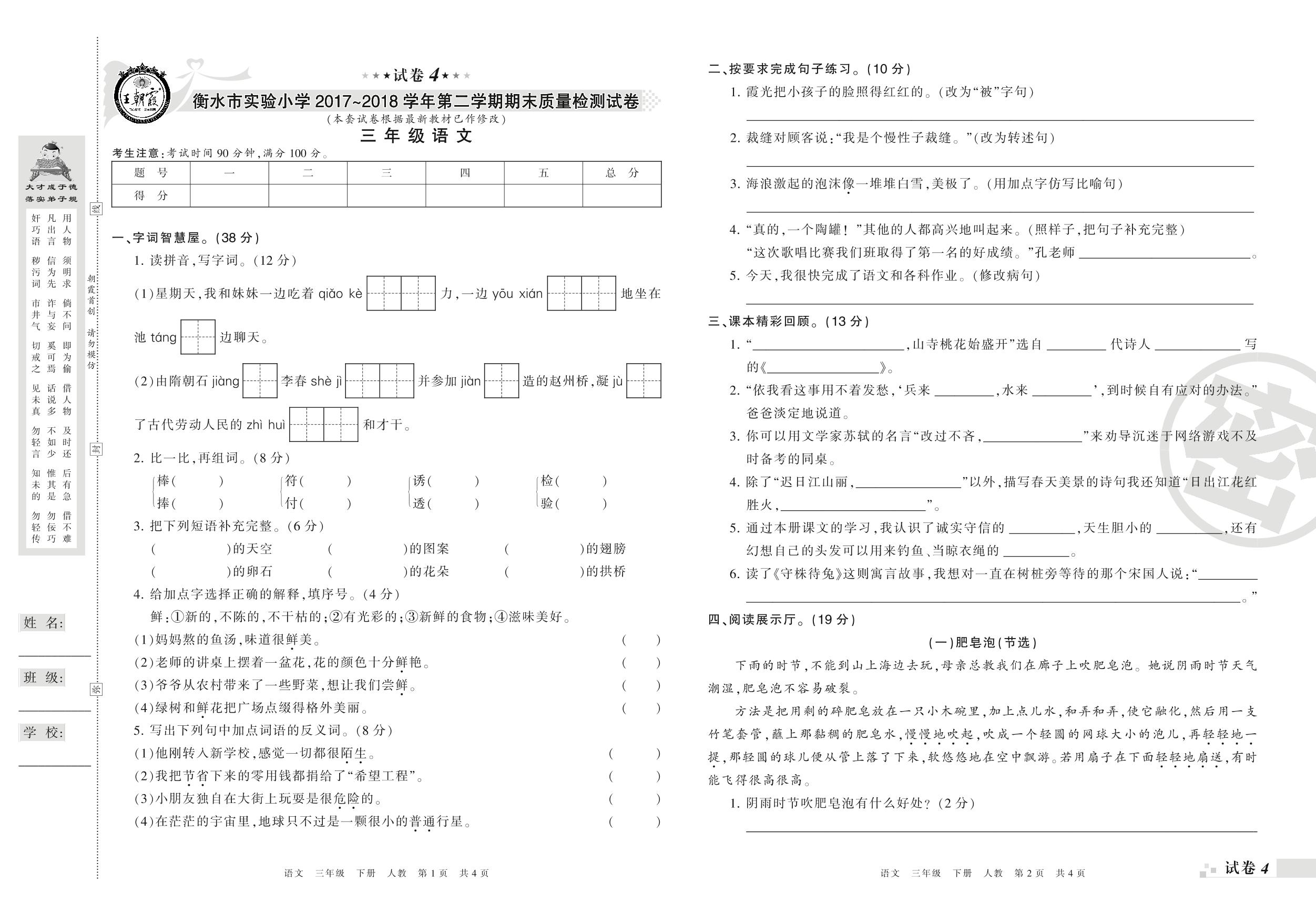 2017-2018学年第二学期衡水市实验小学三年级语文试卷(人教版)【4】