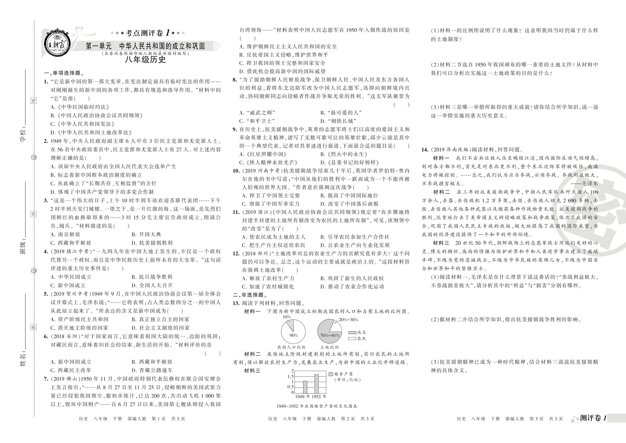 王朝霞期末测评卷——第一单元 中华人民共和国的成立和巩固、第二单元 社会主义制度的建立与社会主义建设的探索(一)八年级下册历史(人教版)【0】