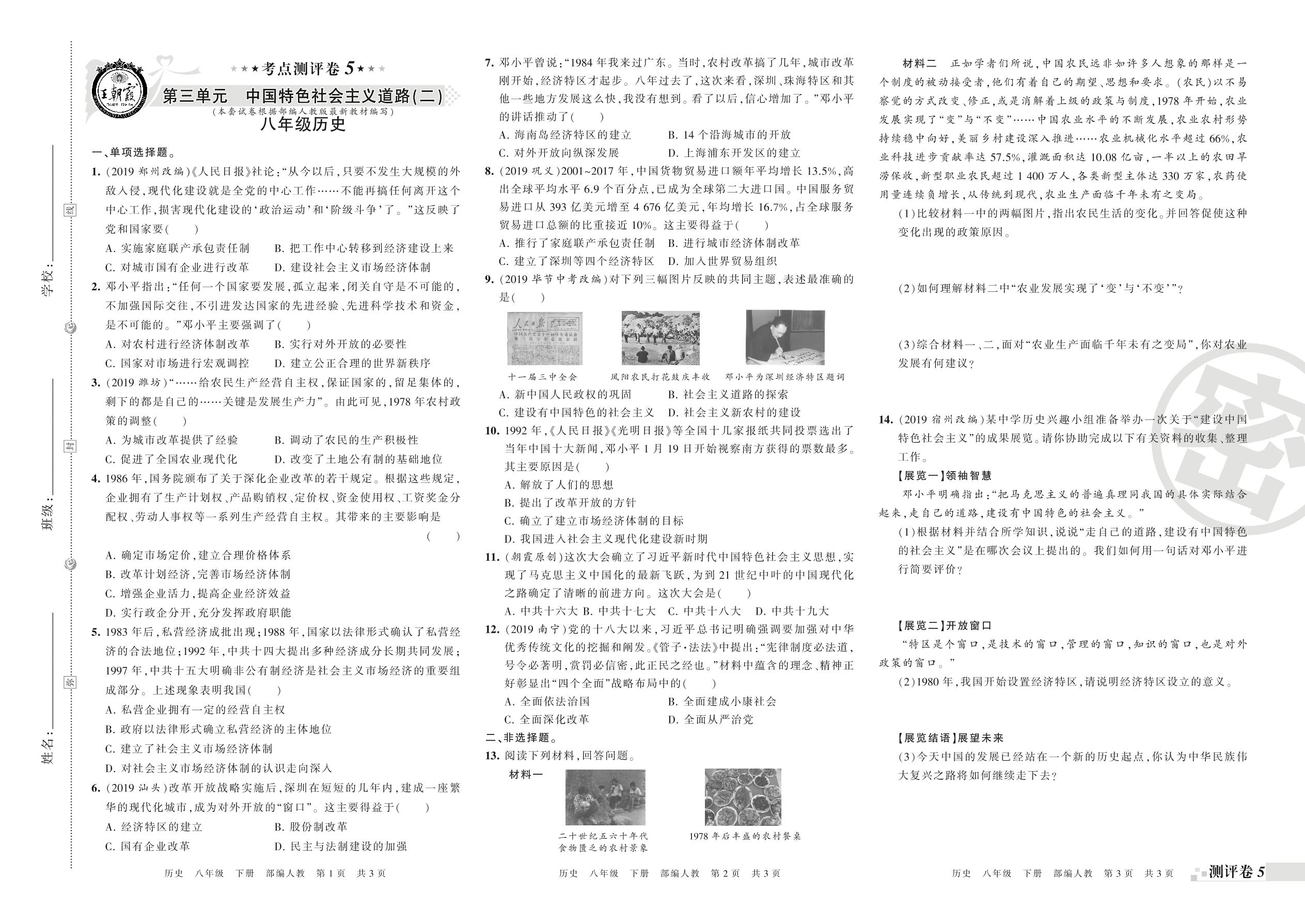 王朝霞期末测评卷——第三单元 中国特色社会主义道路(二)、第四单元 民族团结与祖国统一八年级下册历史(人教版)【0】